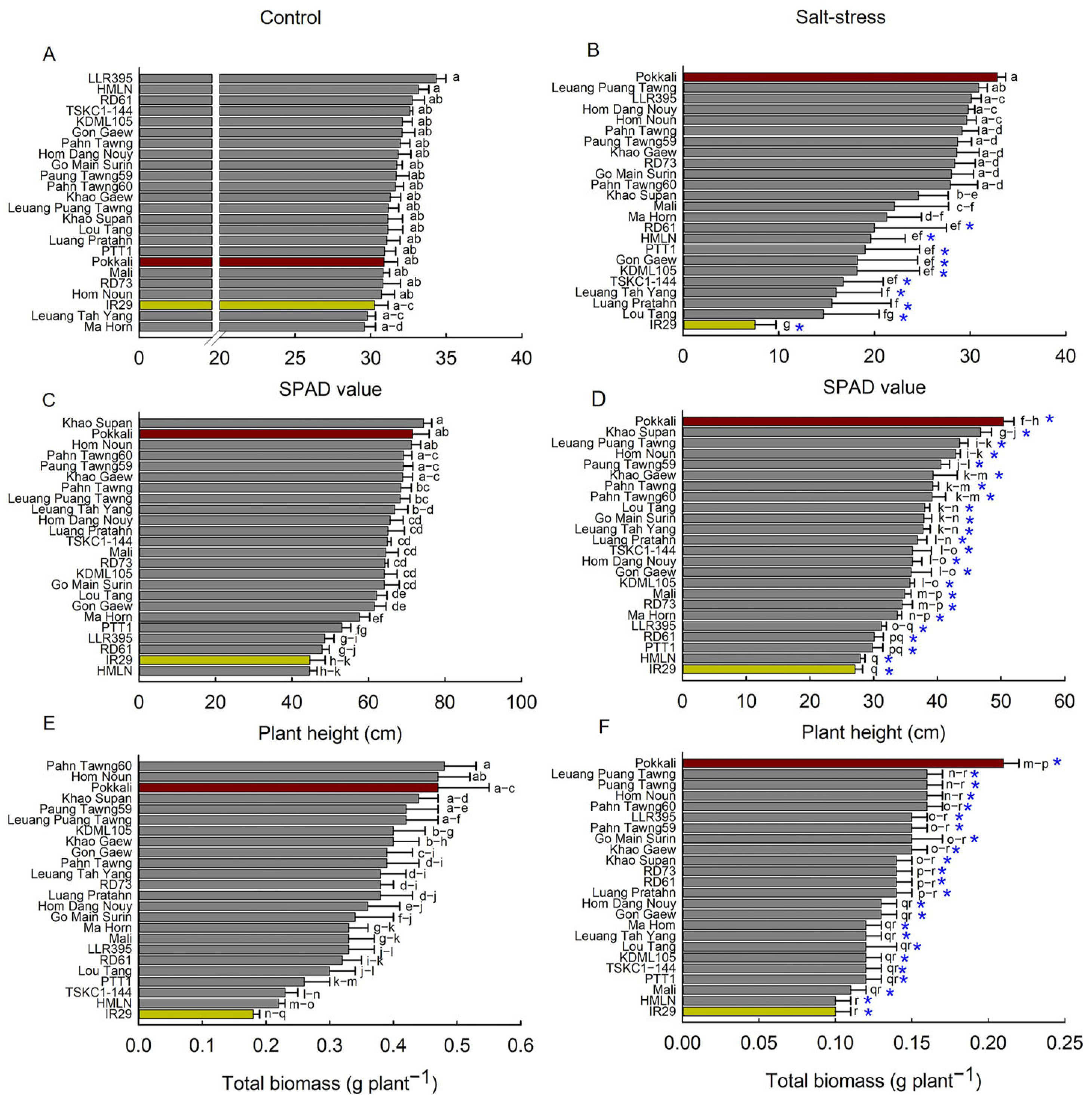 - Pamuta, D.; Siangliw, M.; Sanitchon, J.; Pengrat, J.; Siangliw, J.L.; Toojinda, T.; Theerakulpisut, P. Physio-biochemical traits in improved ‘KDML105’ jasmine rice lines containing drought and salt tolerance gene under drought and salt stress. Chil. J. Agric. Res. 2022, 82, 97–110. [Google Scholar] [CrossRef]