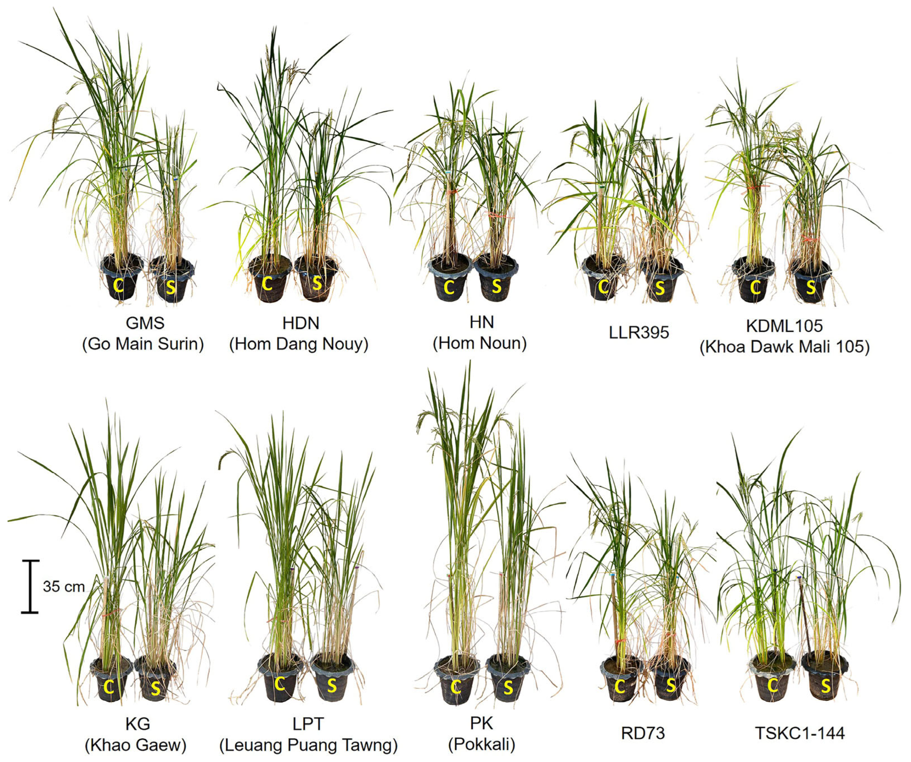 Santanoo, S.; Khianpho, O.; Sanitchon, J.; Theerakulpisut, P. Physiological and Growth Responses of Thai Rice Genotypes to High Salinity Stress at the Seedling and Reproductive Stages. Plants 2025, 14, 3748. https://doi.org/10.3390/plants14243748