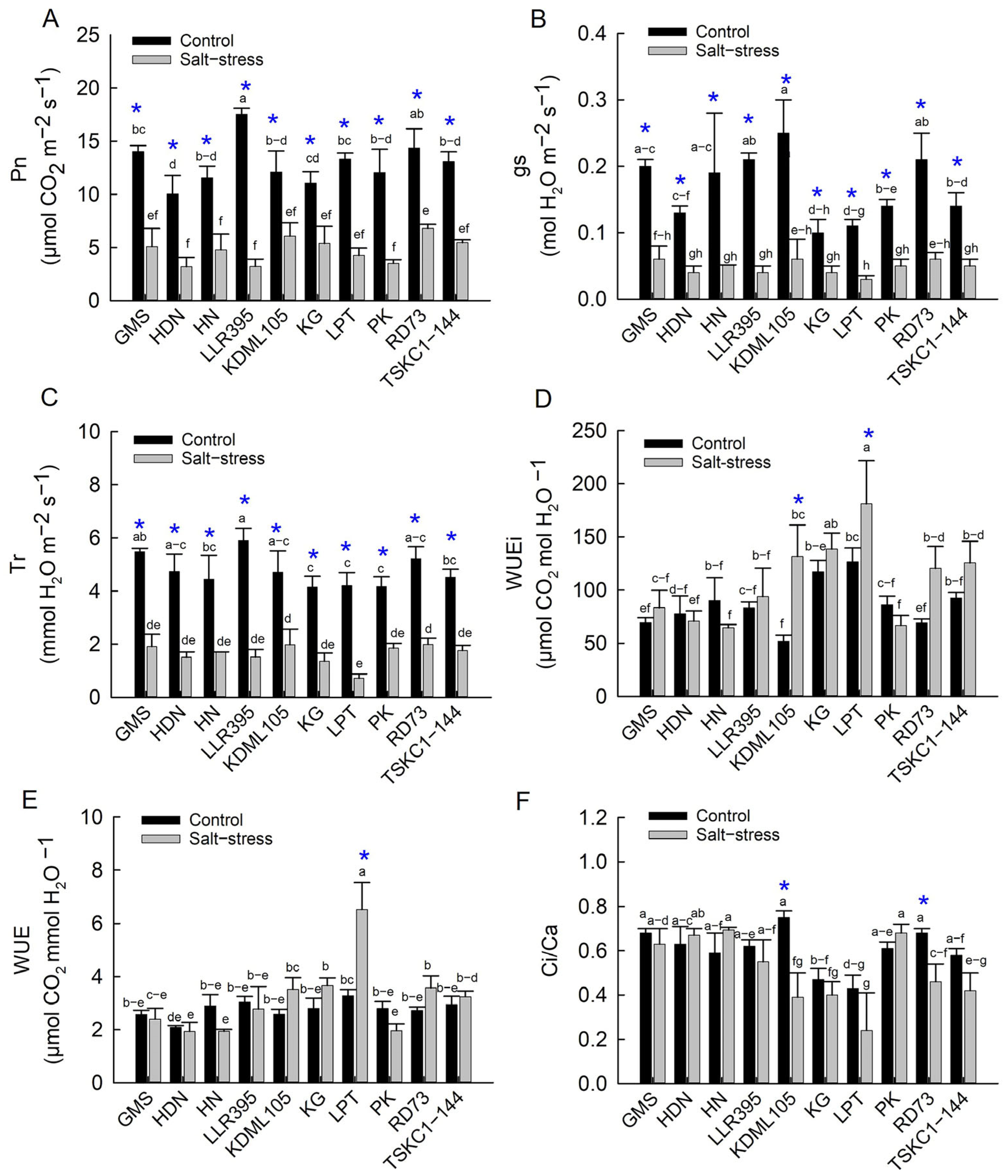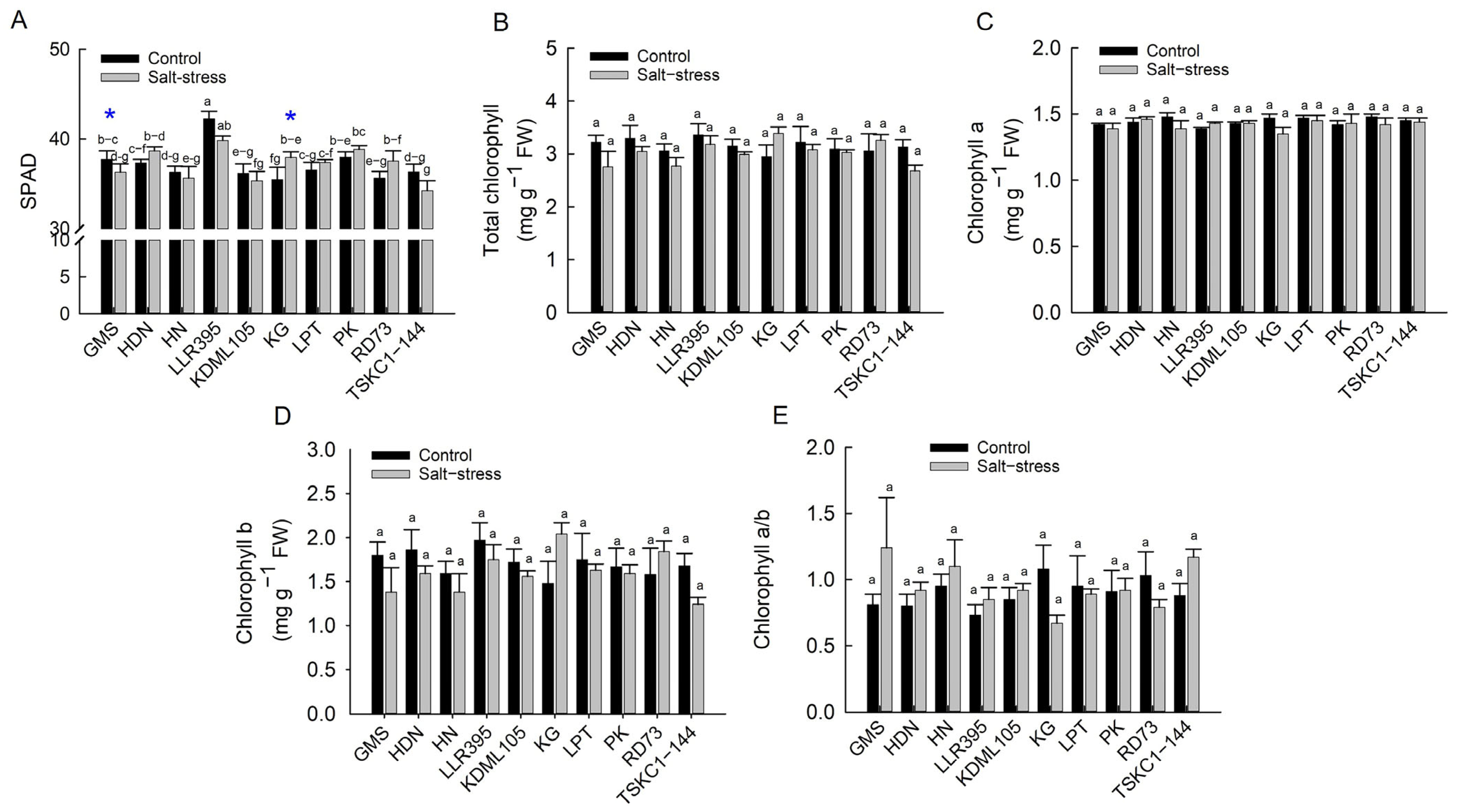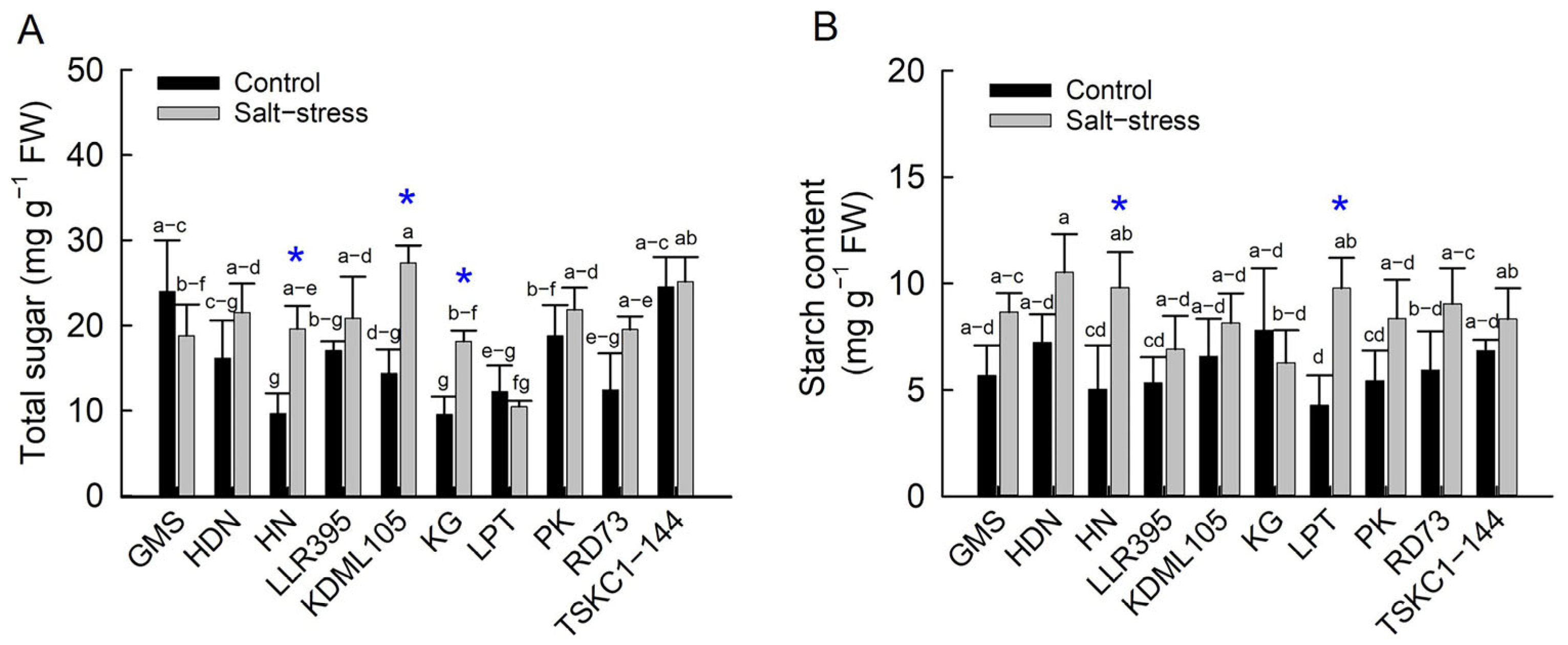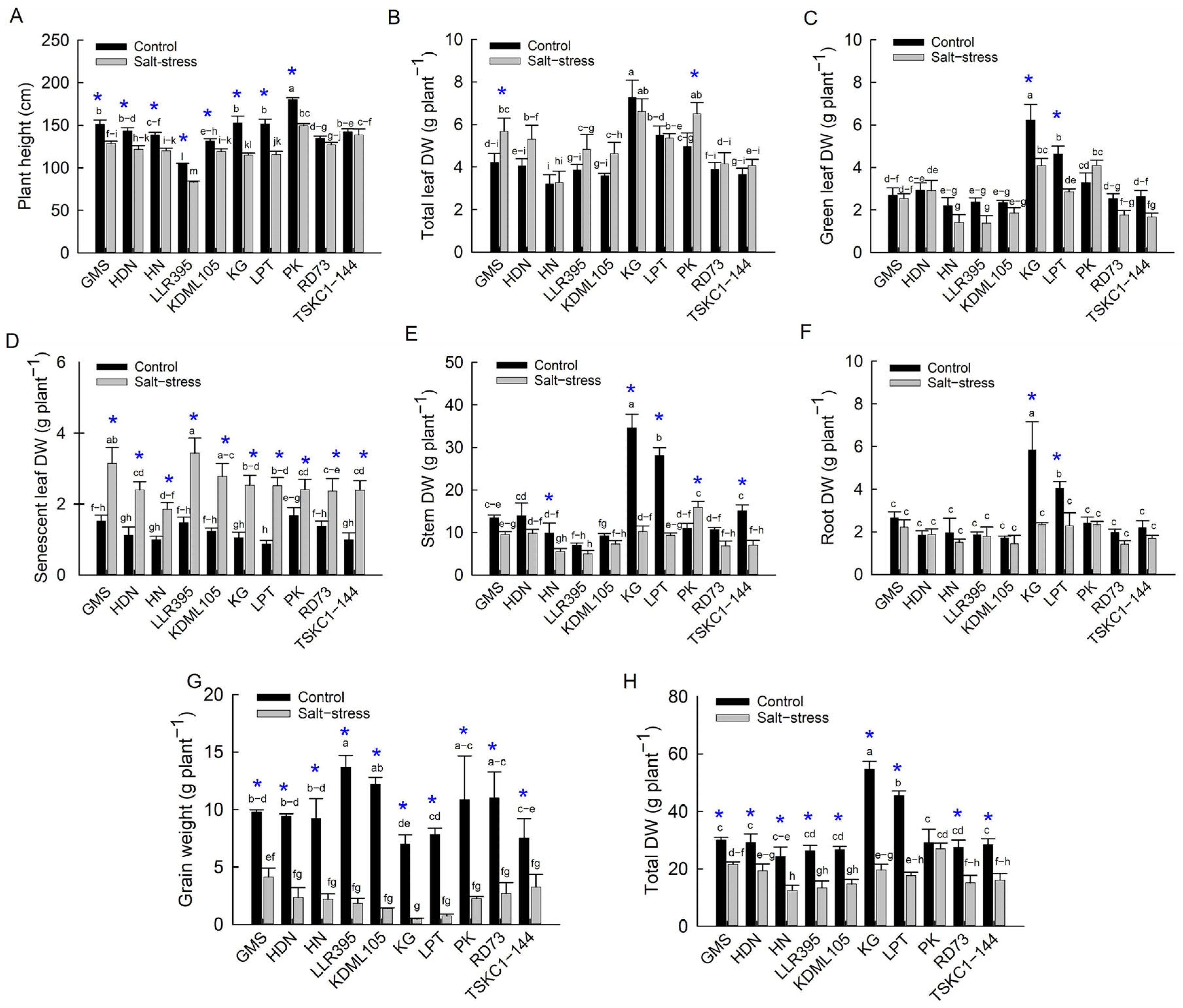 - Xu, Y.; Bu, W.; Xu, Y.; Fei, H.; Zhu, Y.; Ahmad, I.; Nimir, N.E.A.; Zhou, G.; Zhu, G. Effects of salt stress on physiological and agronomic traits of rice genotypes with contrasting salt tolerance. Plants 2024, 13, 1157. [Google Scholar] [CrossRef] [PubMed]