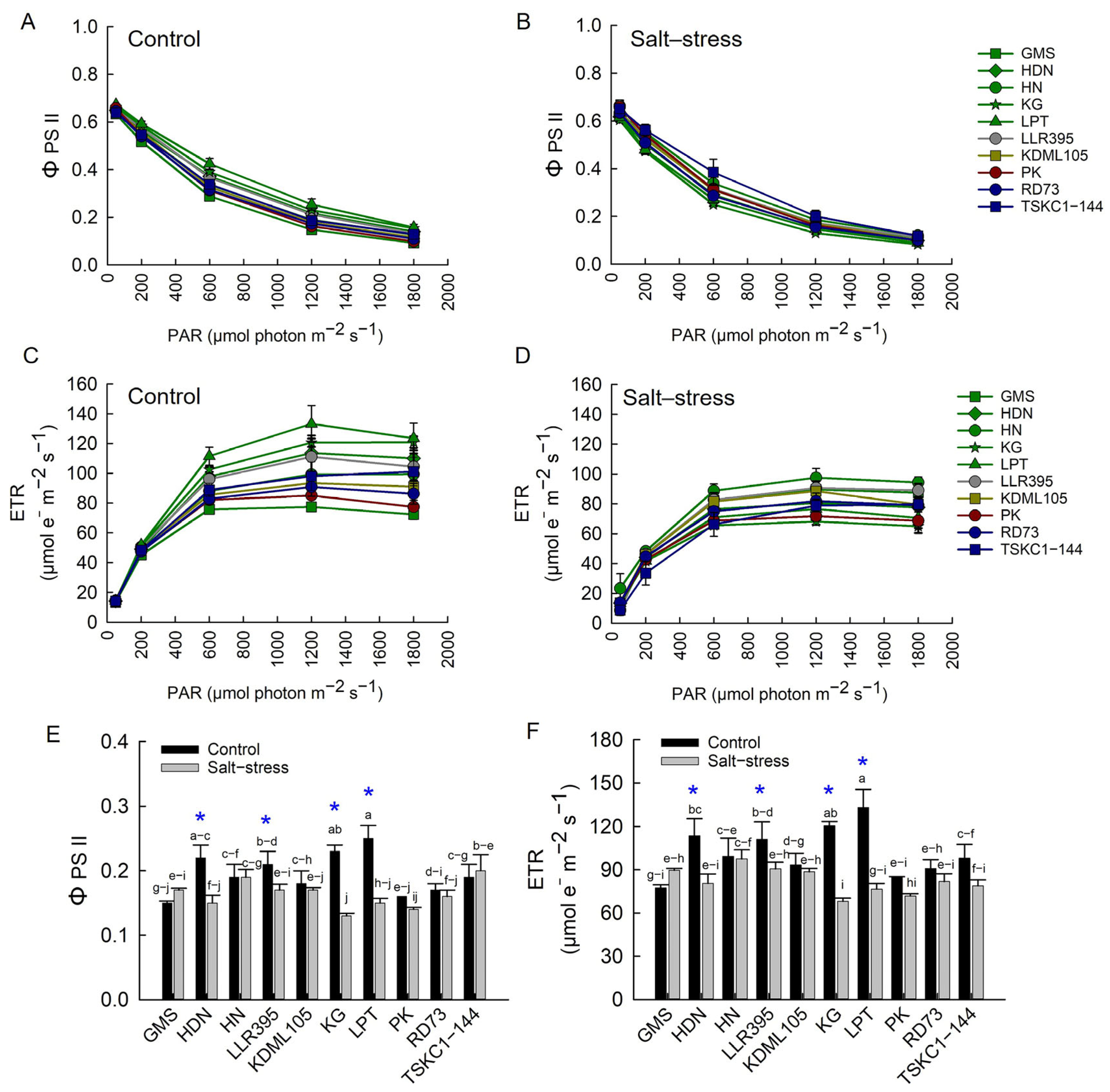 - Pamuta, D.; Siangliw, M.; Sanitchon, J.; Pengrat, J.; Siangliw, J.; Toojinda, T.; Theerakulpisut, P. Photosynthetic Performance in Improved ‘KDML105’ Rice (Oryza sativa L.) Lines Containing Drought and Salt Tolerance Genes under Drought and Salt Stress. Pertanika J. Trop. Agric. Sci. 2020, 43, 653–675. [Google Scholar] [CrossRef]