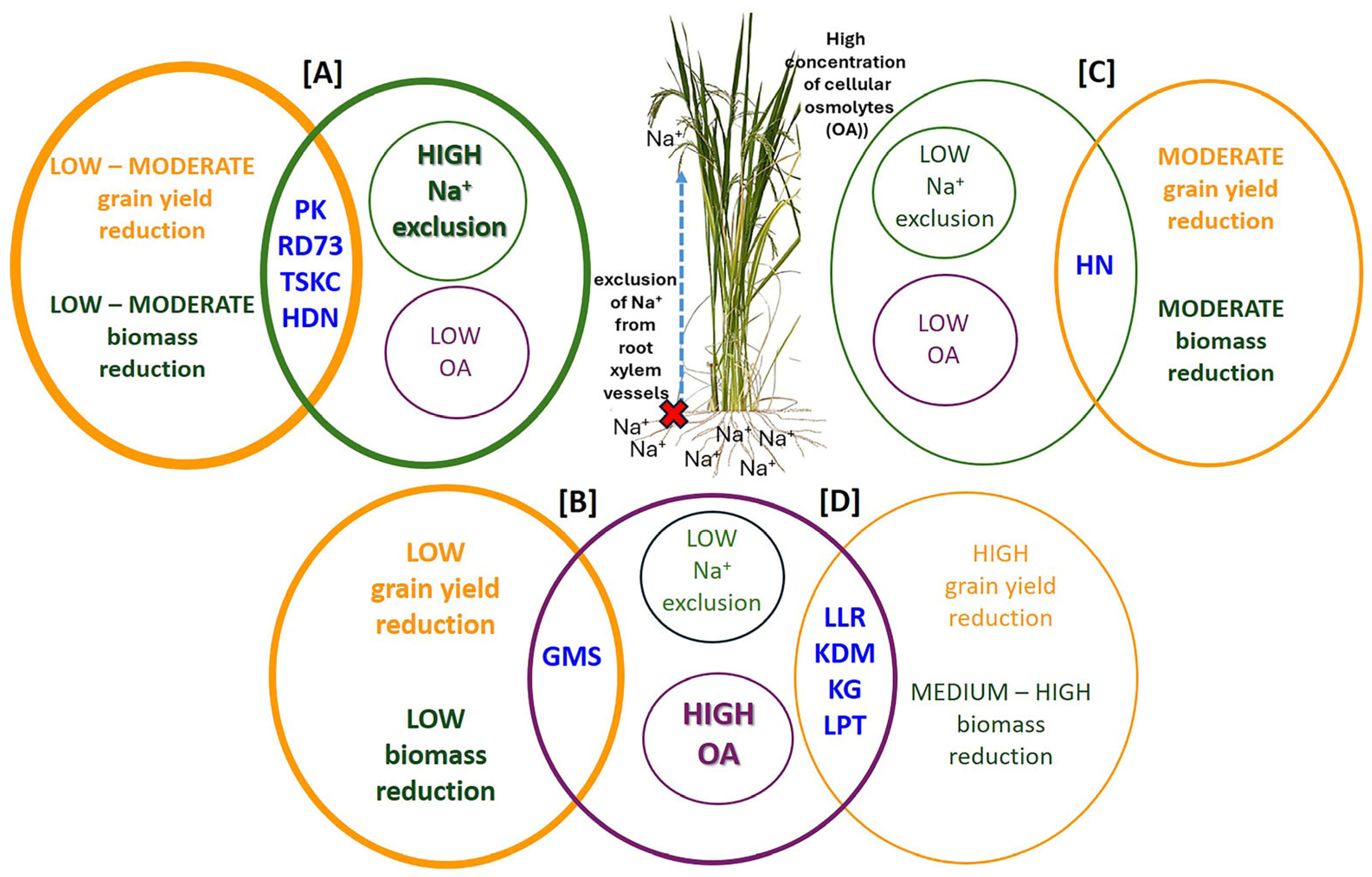 - Mohanty, A.; Chakraborty, K.; Mondal, S.; Jena, P.; Panda, R.K.; Samal, K.C.; Chattopadhyay, K. Relative contribution of ion exclusion and tissue tolerance traits govern the differential response of rice towards salt stress at seedling and reproductive stages. Environ. Exp. Bot. 2023, 206, 105131. [Google Scholar] [CrossRef]