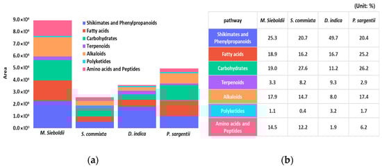 Upon examination of the compositional ratios based on relative peak areas, shikimates and phenylpropanoids were most prevalent in D. indica. Fatty acids dominated in P. sargentii, while carbohydrates were abundant in S. commixta and P. sargentii. Terpenoids were notably present in S. commixta and D. indica; alkaloids were more abundant in M. sieboldii and P. sargentii. Amino acids and peptides had relatively high ratios in M. sieboldii and S. commixta (Figure 1).