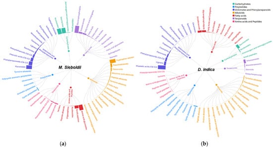 Comparative LC–MS/MS-based sunburst chart analysis of differential metabolite composition in Malus sieboldii and Duchesnea indica seed extracts, constructed using the Flourish platform. The hierarchical organization of metabolite classes is visualized using a radial tree diagram format. Relative abundances (fractional proportion) of specialized metabolite classes in the seed extracts of (a) M. Sieboldii and (b) D. indica. The size and color of each segment directly correspond to the relative contribution of each metabolite class to the total detected compounds.