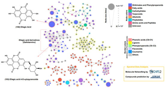 The GNPS spectrum library was used to analyze the MS/MS spectra of the extract’s compounds through feature-based MN and the SIRIUS program (Figure 3 and Figure 4). Network annotation propagation (NAP) analysis identified ellagic acid (158), a shikimate and phenylpropanoid derivative, as the largest node (Figure 3). Compound 153, which contained a xylosyl group, was classified in a separate cluster from ellagic acids (158).