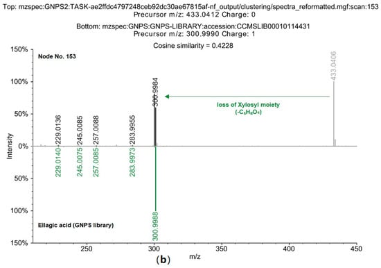 Comparisons of the MS/MS pattern with the GNPS library (Figure 4) confirmed that the node ellagic acid (158) matched the standard spectrum with a cosine score of 0.9962, identifying it as a key marker compound in the phenolic profile of D. indica [49]. This result corroborates previous findings for the ethanol fraction of whole D. indica, where ellagic acid and its glycosides were quantitatively prominent (30.52 mg/100 g). The current GNPS analysis similarly confirmed the presence of these phenolics in D. indica seeds [50].