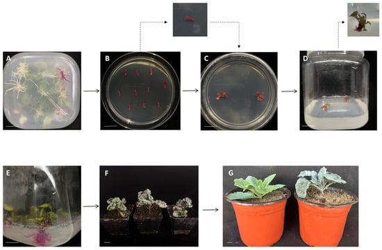 Transgenic root-induced regeneration plant process. (A) Transgenic roots obtained via genetic transformation; (B,C) Bud regeneration induced from transgenic root systems; (D) Elongation growth of adventitious shoots; (E) Rooting induction for seedling establishment; (F) T0 transgenic seedlings at approximately 30 days of growth; (G) Transgenic plant (right) and wild-type plant (left) were compared after being transplanted into the field. (A–C) Approximately 15 days; (C–E) Approximately 30 days; (F) Seedlings at approximately 30 days. (Scale bar = 20 mm).