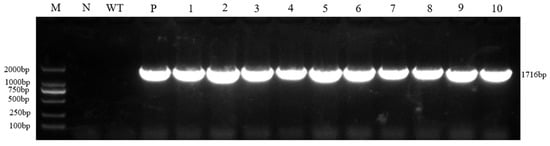 To verify the successful integration of the vector gene in the regenerated plants selected via the Ruby red marker, molecular identification of the obtained regenerated lines was performed using the Cas9 gene contained in the vector as the detection target. The results showed that all regenerated plants produced specific bands consistent with the expected size (1716 bp), while no such band was observed in the wild-type control, and the positive plasmid control exhibited the expected amplification signal. These findings indicate that all regenerated plants selected based on the red marker are transgenic positive and successfully carry the target vector sequence (Figure 2).