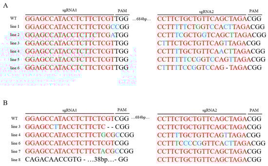 Gene Editing Results. (A) Gene Bol018774; (B) Gene Bol041392; Black: PAM (Protospacer Adjacent Motif) sequence; Red: sgRNA target site; Blue: Base substitutions; Green: Base insertions; “-”: Base deletions; Lines 1–8: Gene-edited plant variants; WT: wild-type; sgRNA1 and sgRNA2: two target sites within the PUB13 gene; PAM sequence: denoted in black on the figure.