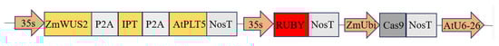 The WIP-RUBY-Cas9 vector, maintained by the Chinese Cabbage Systems Biology Laboratory at Nanjing Agricultural University’s College of Horticulture (Figure 4), was utilized for this study (https://www.molecularcloud.org/plasmid/WIP-RUBY-cas9/MC-0101503.html (accessed on 13 June 2025)) [27]. Based on the two homologous genes of cabbage (Brassica oleracea var. capitata) PUB13 (Bol018774 and Bol041392), we designed targeted editing strategies to modify both alleles. Utilizing the CRISPR design tool developed by Huazhong Agricultural University (http://cbi.hzau.edu.cn/crispr/ (accessed on 12 June 2025)), we designed sgRNAs targeting the PUB13 gene sequence (Table S1). Subsequently, the sgRNA expression cassettes were chemically synthesized in vitro. The expression cassette was inserted into the WIP-RUBY-Cas9 vector via the AscI restriction site to construct the final CRISPR/Cas9 gene editing vector. The vector plasmid was transferred to Agrobacterium K599 using the freeze–thaw method. After incubating at 28 °C in a bacterial dark incubator for 2 days, positive clones were picked from the plates and transferred to 1 mL of LB (Lennox Broth) liquid medium containing 50 mg·L−1 kanamycin (Kan) and 50 mg·L−1 streptomycin (SM) in LB liquid medium and incubated overnight in a dark, 28 °C, 250 r·min−1 shaking incubator. PCR validation was performed using carrier-specific primers RUBY-F and RUBY-R (Table S1).