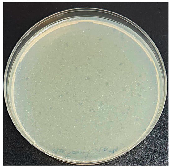 Plaque assay showing well-defined lytic plaques (~2 mm in diameter) formed by phage P284 on A. tumefaciens lawn.