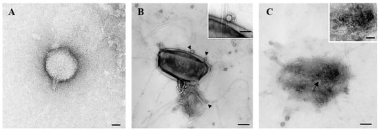 Transmission electron microscopy (TEM) analysis revealed that phage P284 displayed a C1 podovirus morphotype, with an isometric head measuring 50 nm in diameter, with a short, non-contractile tail of approximately 15 nm (Figure 2A). Ultrastructural examination further demonstrated that adsorption of P284 particles onto the surface of BPIC284 cells occurred 30 min post-infection (pi) (Figure 2B). At this stage, bacterial cell lysis was evident, accompanied by the release of numerous progeny phage particles (Figure 2C).