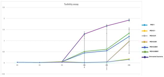 Turbidity assay showing the inhibitory effect of P284 treatment on BPIC284 growth at different MOI. Optical density (OD600) was monitored over 48 h. All phage-treated samples exhibited a marked suppression of bacterial growth compared to the untreated control, with the strongest inhibition observed at higher MOIs (1 and 0.1). Error bars represent standard deviations from three independent replicates.