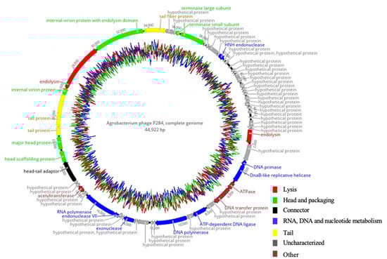 P284 revealed a double-stranded DNA genome structure, composed of 44,922 bp in length. The genome was shown to encode 66 predicted coding sequences (CDSs), of which 23 CDSs (34.9%) were assigned to specific functions, while 43 (65.1%) were of unknown functions. These annotated genes are associated with DNA replication and regulation, DNA packaging, structural proteins, and host cell lysis, as highlighted in the genomic map (Figure 4). No tRNA-encoding genes were identified using Prokka and Geneious analyses. Furthermore, comprehensive genome evaluation (CGE) analysis confirmed the absence of genes linked to antibiotic resistance, lysogeny, toxins, or other virulence factors, supporting the suitability of P284 as a candidate biocontrol agent.