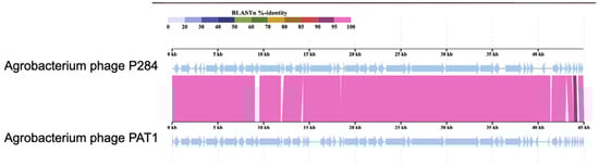Comparative genomic analysis revealed that P284 shares the highest nucleotide sequence identity with Agrobacterium phages PAT1 (94%; accession PQ082932.1) (Figure 5), Atu_ph02 (78.7%; accession NC_047845) and Atu_ph03 (78.5%; accession NC_047846), both members of the genus Atuphduovirus (subfamily Dunnvirinae), known to infect A. tumefaciens, which, according to ICTV demarcation criteria (95% species threshold), confirms that P284 represents a novel species within the same taxonomic order, Autographivirales.