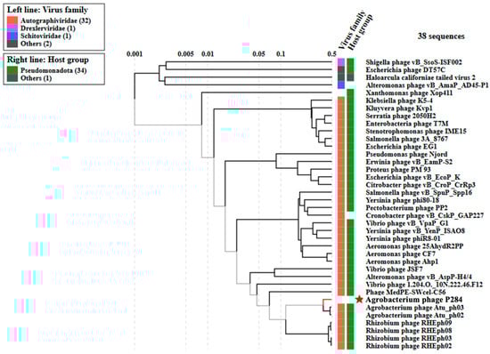 Proteomic tree of P284, generated by ViPTree (version 4.0) based on genome-wide sequence similarities computed by tBLASTx, showing a close relationship with Agrobacterium phage ph03 and ph02. This phylogenetic tree was generated on 30 September 2025, and the VipTree database had not yet been updated to reflect the most recent taxonomic ratifications. Note that in 2025, the family Autographiviridae was elevated to the rank of order and renamed Autographivirales. The star indicates the phage P284 identified in this study.