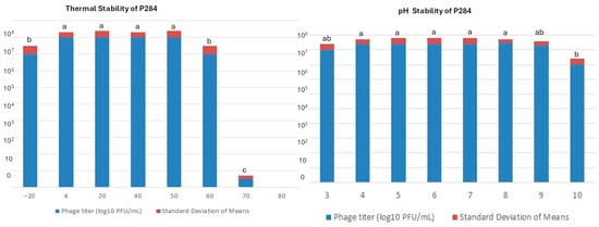 The stability of P284 under different thermal and pH conditions was evaluated. Thermal assays showed that P284 maintains high infectivity from 4 °C to 50 °C, with modest but statistically significant reductions at −20 °C and 60 °C, and an almost complete loss of activity at 70 °C, indicating a thermal inactivation threshold (Figure 7). Similarly, pH assays demonstrated that P284 remains stable between pH 3 and pH 9, with no significant differences across these treatments, while a marked decrease in titer was observed at pH 10 (Figure 7).