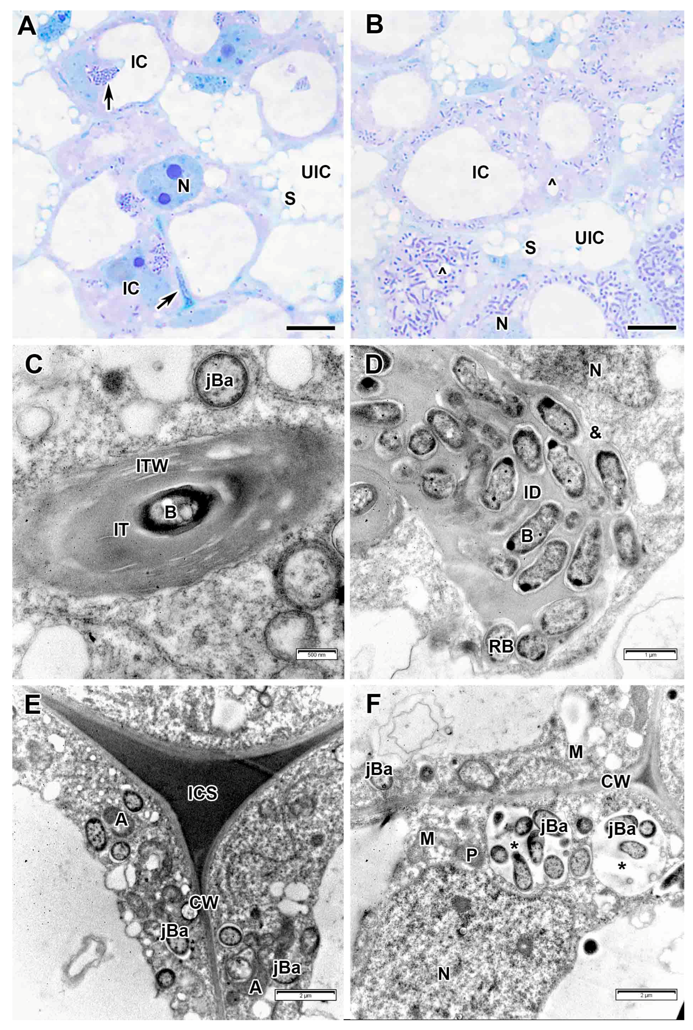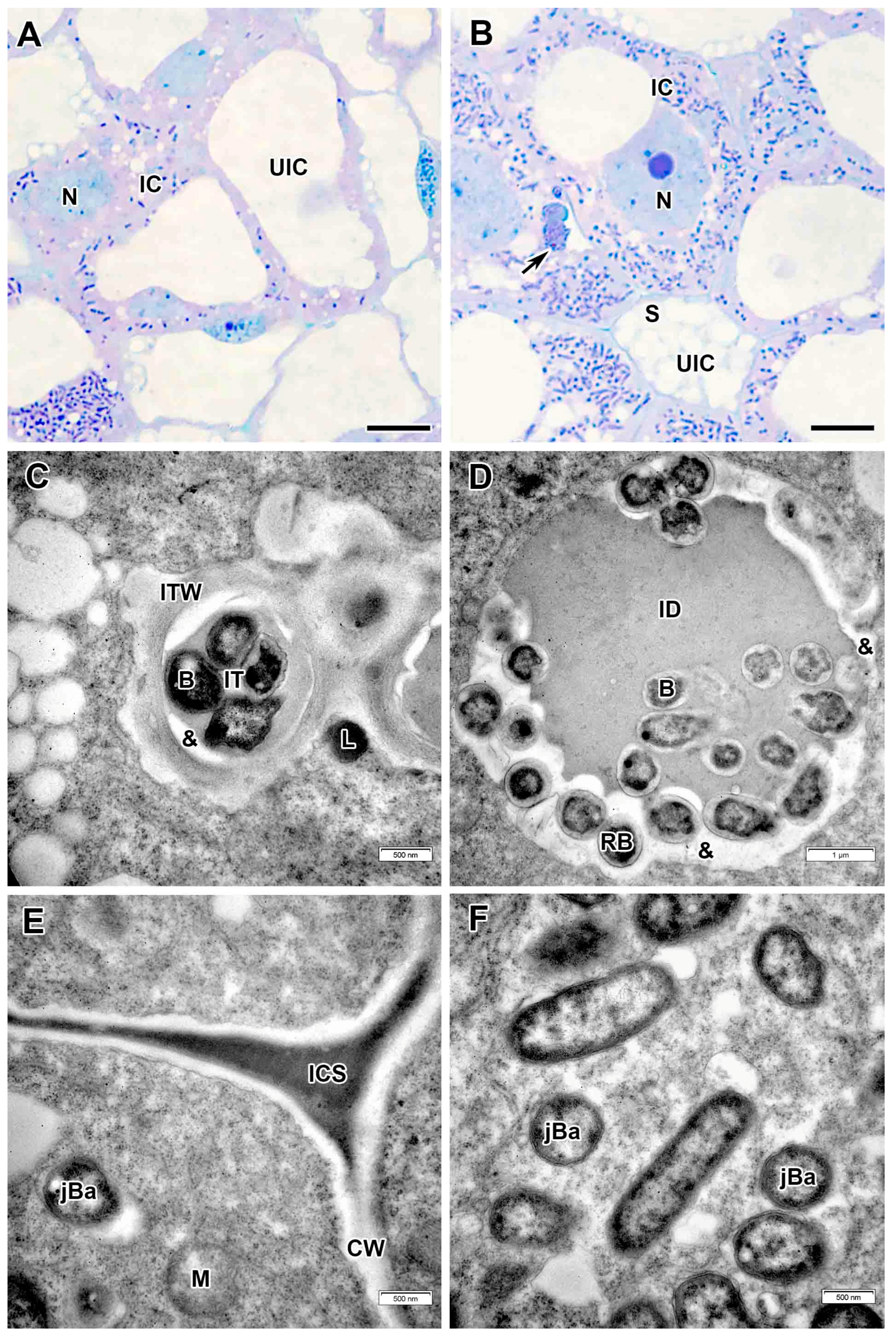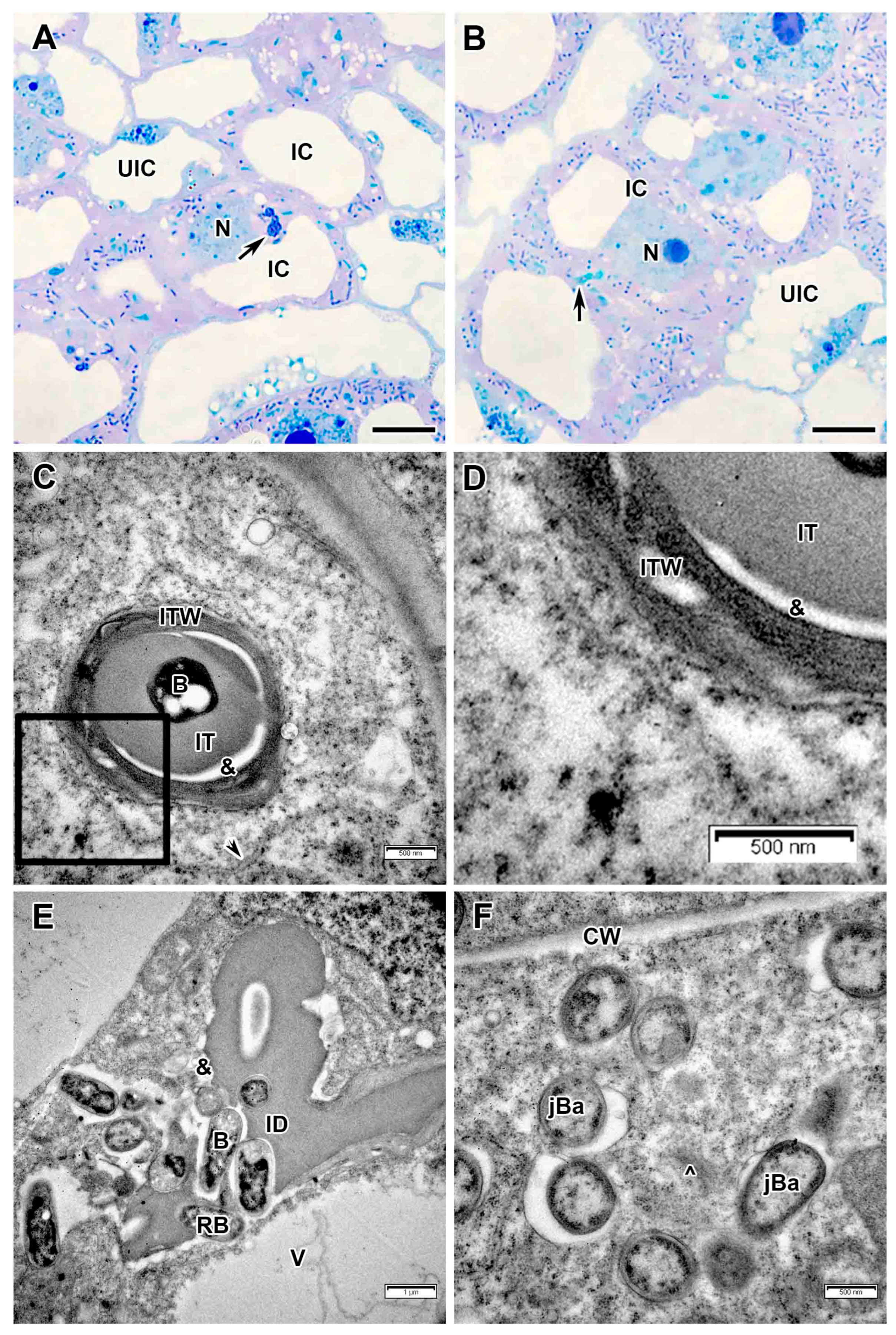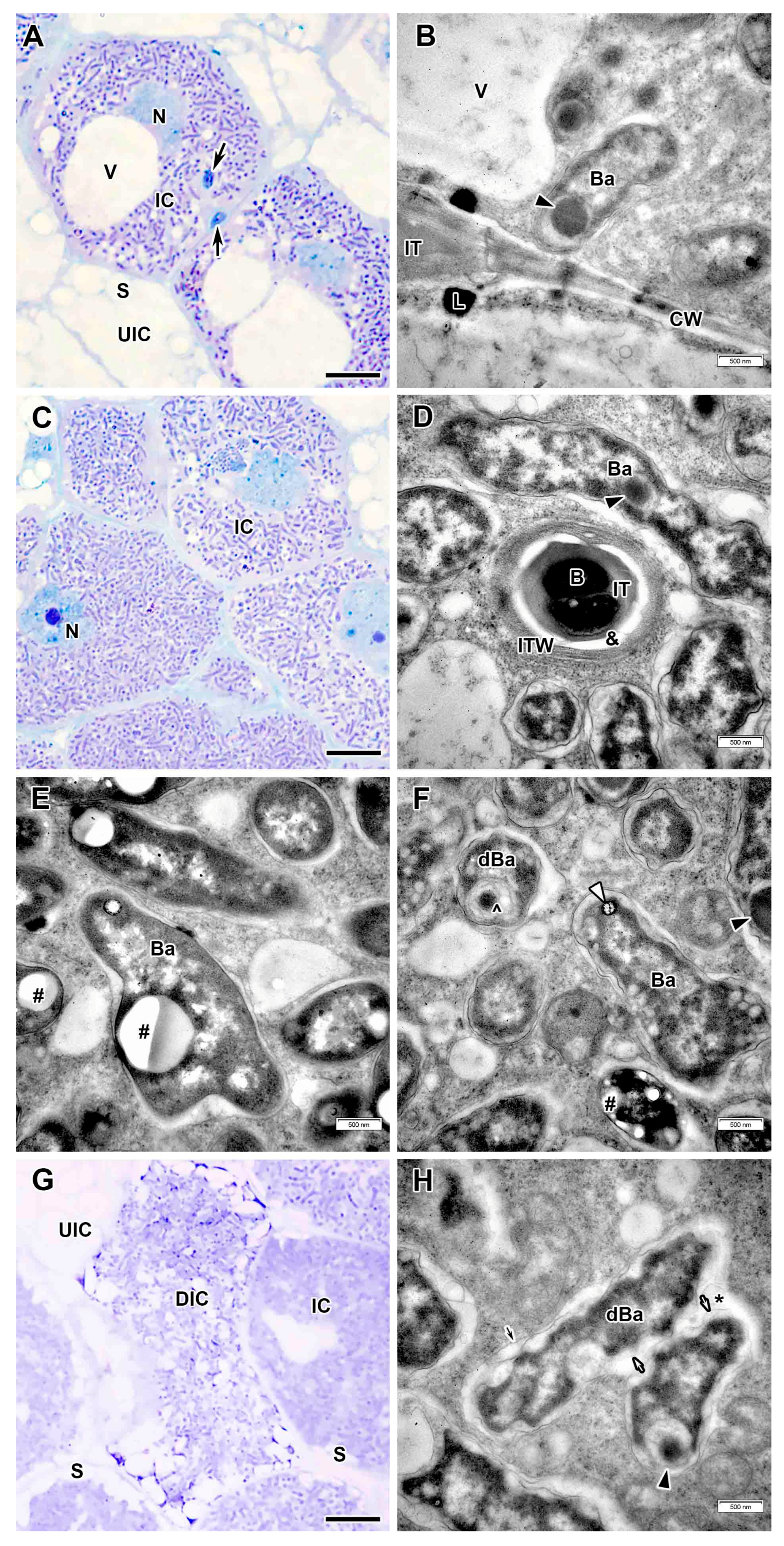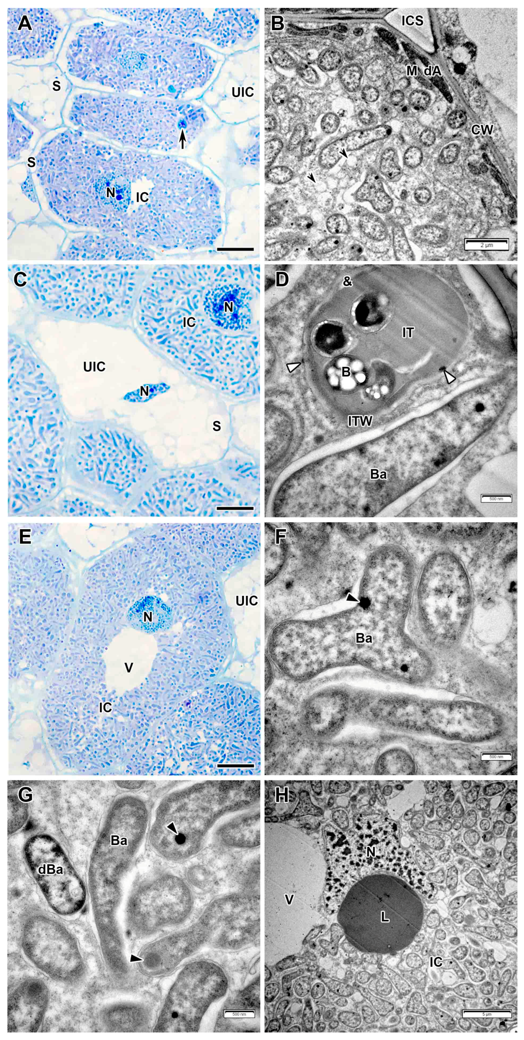 - Vasse, J.; de Billy, F.; Camut, S.; Truchet, G. Correlation between ultrastructural differentiation of bacteroids and nitrogen fixation in alfalfa nodules. J. Bacteriol. 1990, 172, 4295–4306. [Google Scholar] [CrossRef]