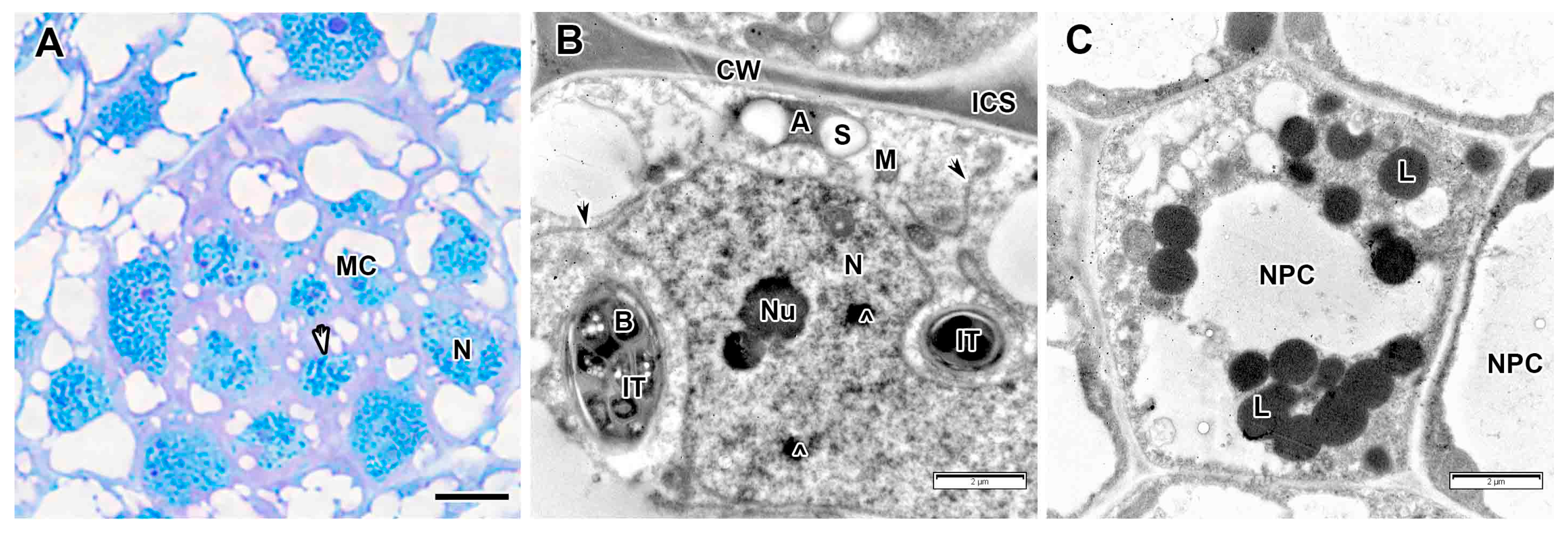 - Bal, A.K.; Khetmalas, M.B. Pre- and postwinter changes in the root nodules of Lathyrus maritimus (L.) Bigel. with special reference to storage organelles. Int. J. Plant Sci. 1996, 157, 432–439. [Google Scholar] [CrossRef]
