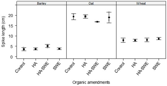 Effect of humic acid (HA), seaweed extract (SWE), and a mixture of HA and SWE (HA+SWE) on the spike length of cereal crops. The black squares represent the mean spike length (cm) of the crops under each organic amendment. The vertical bars represent a 95% confidence interval. The hollow circles represent the replicates. Data were collected at the conclusion of the 2021–2022 winter growing season experiment. Each mean value represents n = 3 replicates per treatment × crop species.
