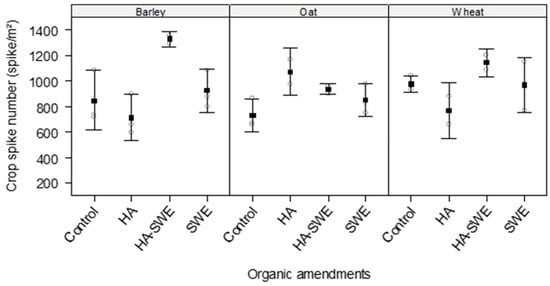 Nonetheless, a significant interaction between crop species and treatments (F6,18 = 3.41, p = 0.020) was observed (Table 1), indicating that the response of spike number to organic amendments varied by cereal species (Figure 2). The spike number of barley (1328 spike m−2) and wheat (1144 spikes m−2) was highest under the HA+SWE organic amendment, whereas that of oats was highest under the HA organic amendment (1072 spikes m−2).