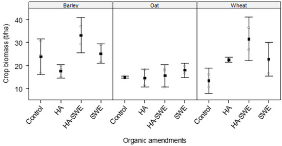 The collected data were statistically analysed using R i386 software v.3.5.3 [72]. Two-way ANOVA was 566 performed to examine the effects of crop species (barley, oats and wheat) and soil amendment treatments (control, HA, SWE and HA+SWE) on aboveground crop biomass. The significant differences among soil amendment treatments were separated at the 0.95% confidence interval [72,73]. A basic linear model was performed with the two-way ANOVA to examine the effects of crop species (barley, oats and wheat) and soil organic amendment treatments (control, HA, SWE and HA+SWE) on aboveground crop biomass. The source of variances and statistical values of all parameters are listed in Table 3.