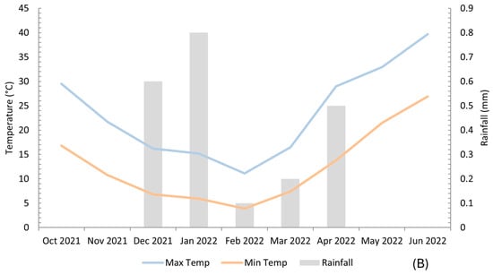 Amarah City has a hot desert climate, characterised by extremely hot, dry summers and cool, wet winters. The temperature ranges between −1 °C and 26 °C from December to February and 33–40 °C from March to May, reflecting its characteristic dryness and significant thermal fluctuation throughout the year. The climatic characteristics of the study site are presented in Figure 7. The mean temperature during the growing season was approximately 18.1 °C, and the total rainfall was approximately 2.2 mm. Figure 7B shows the monthly average temperature and precipitation during the study period. The average temperature decreased from October to February, then increased from March to June. In contrast, the average precipitation exhibited a fluctuating pattern: it steeply increased from October to January and from March to April, then drastically declined from January to February and from April to June [69,70].