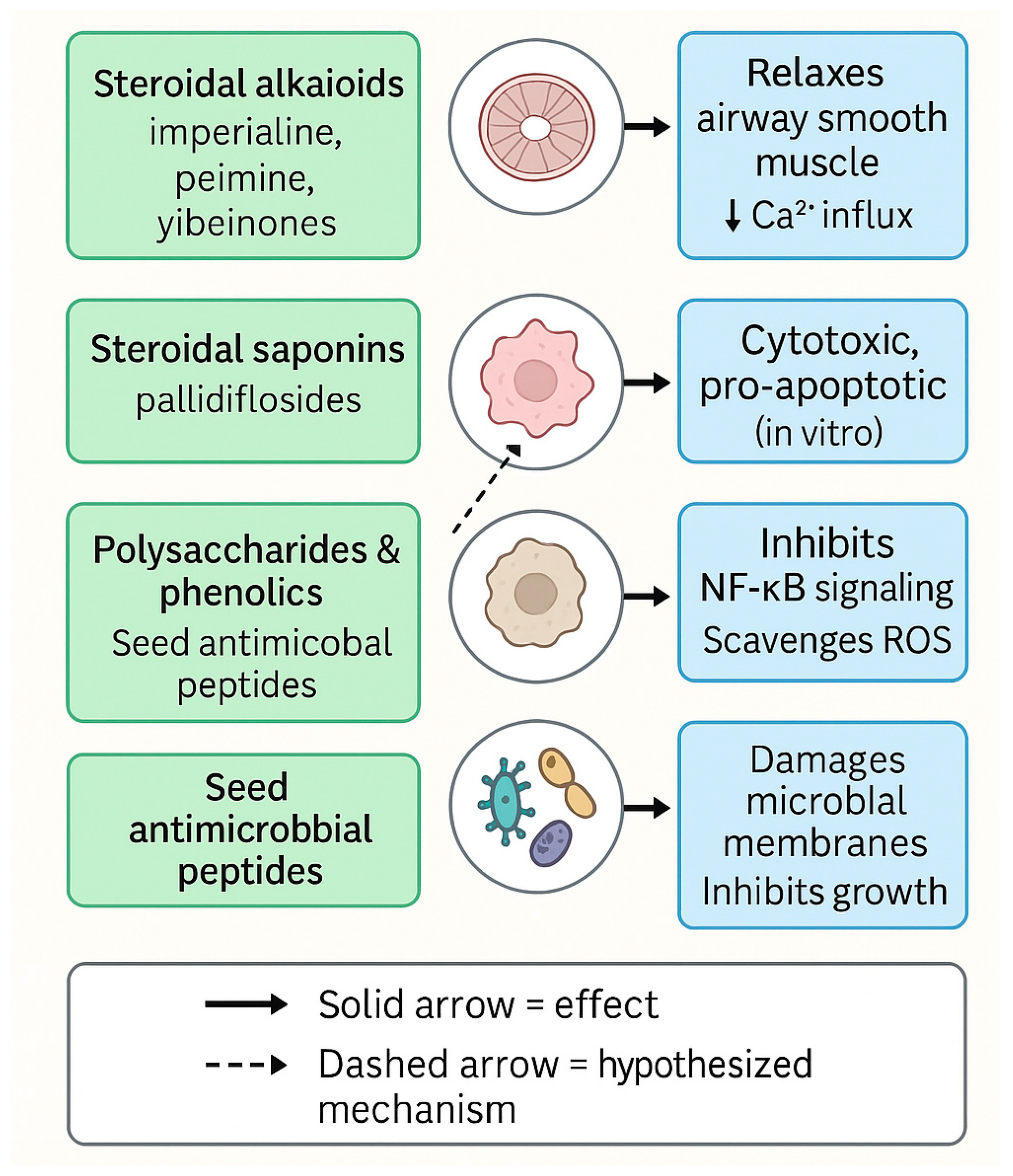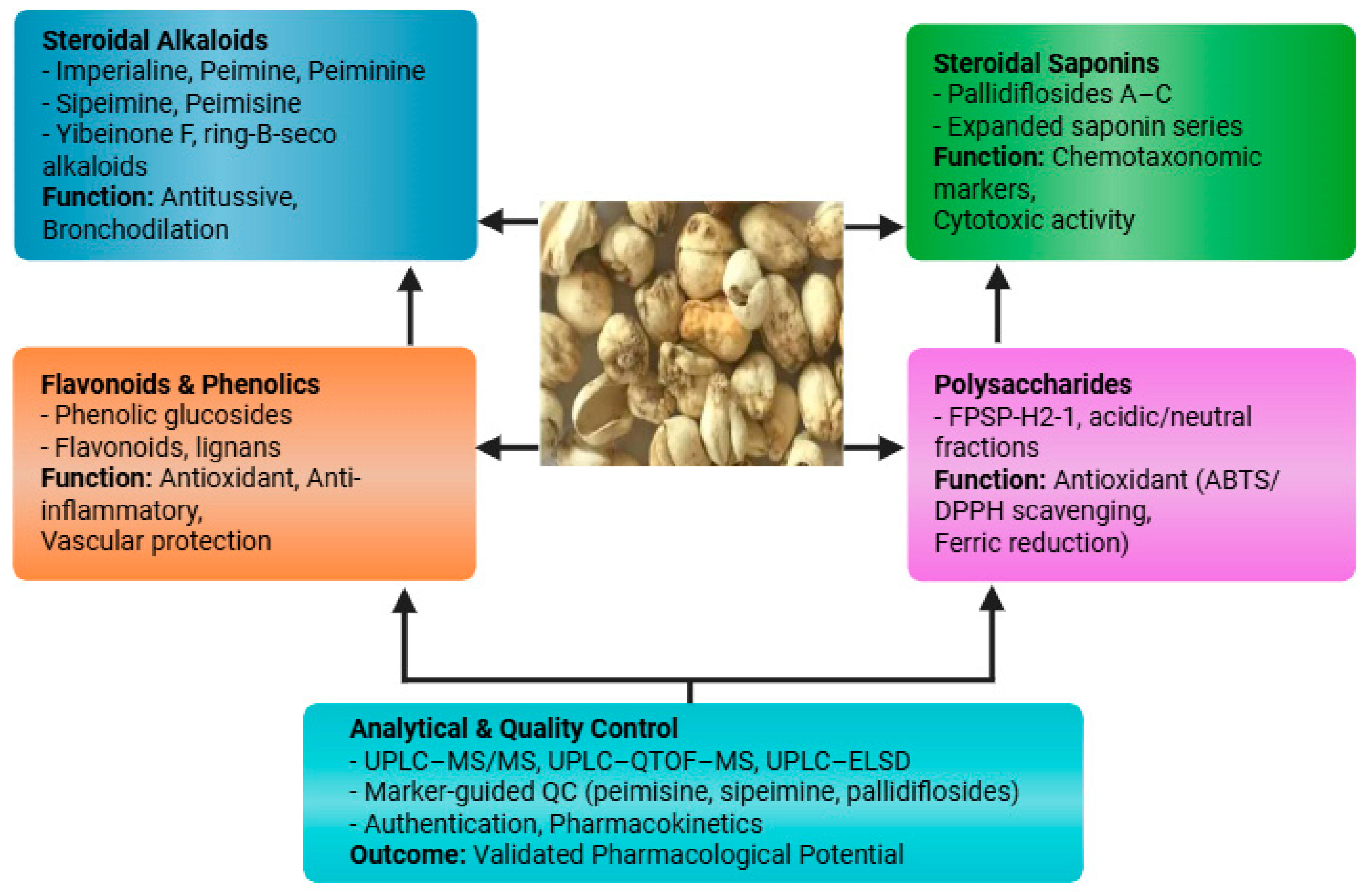 | Peimine/Peiminine | Steroidal isosteroidal alkaloids | Respiratory and anti-inflammatory signals in genus; QC markers | [49] |