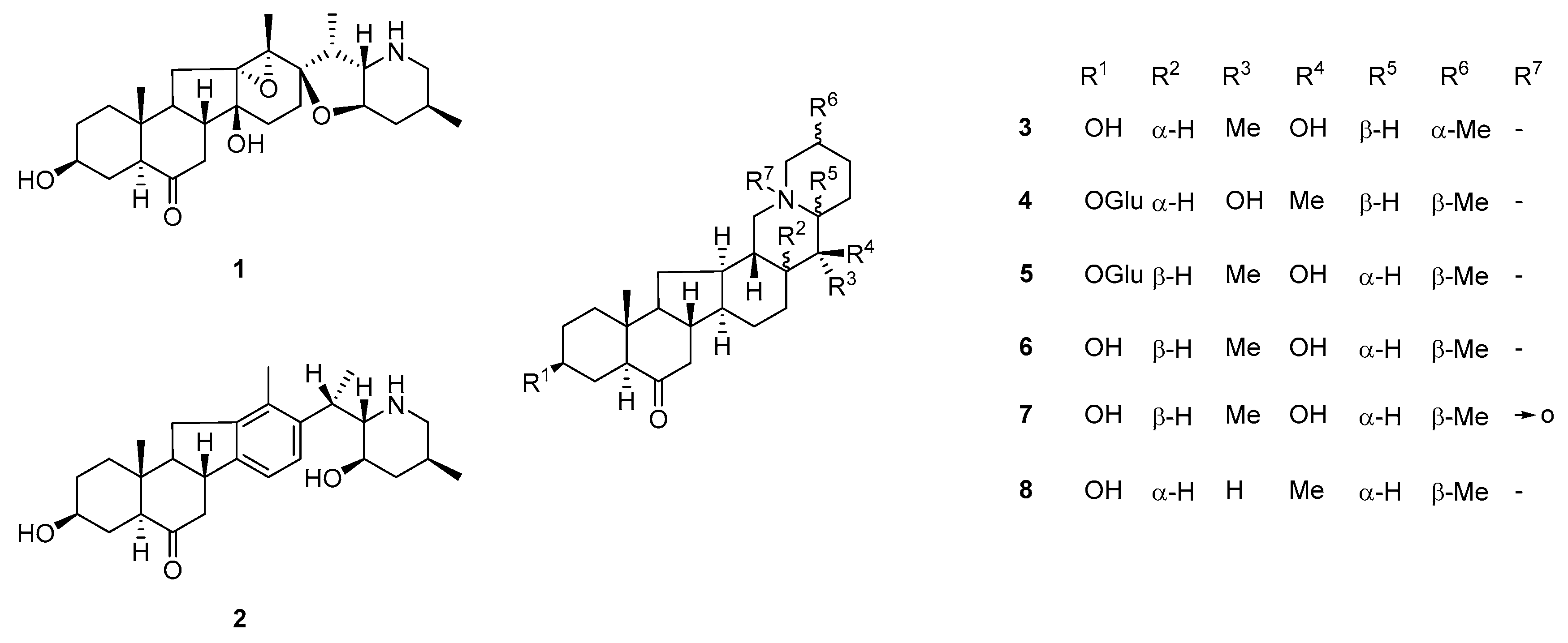 - Wang, D.; Li, Z.; Zhang, L.; Atanasov, A.G.; Wang, S. Characterization of the Isosteroidal Alkaloid Chuanbeinone from Bulbus of Fritillaria pallidiflora as Novel Antitumor Agent in Vitro and in Vivo. Planta Medica 2016, 82, 195–204. [Google Scholar] [CrossRef]