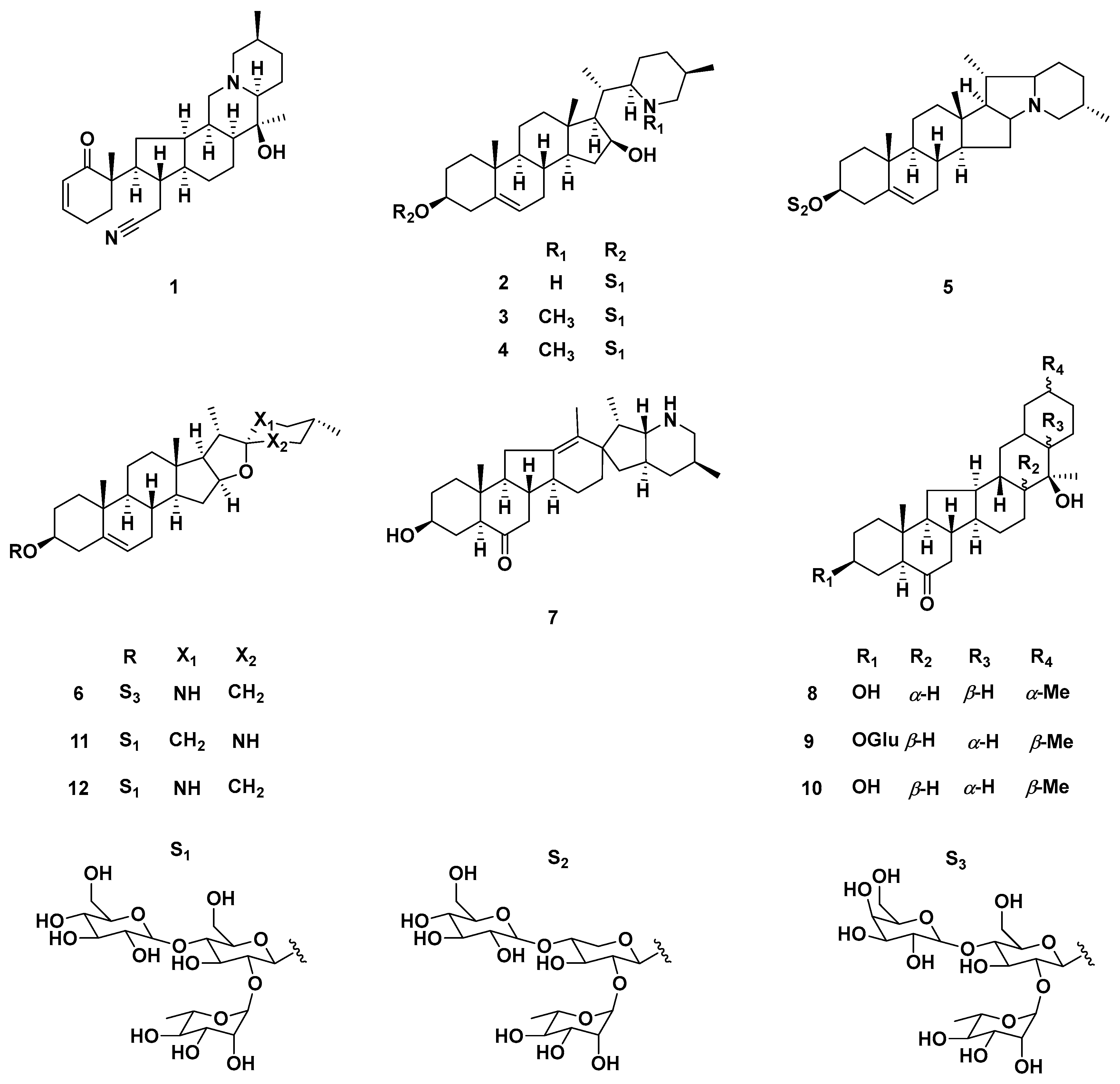 - Jia, Y.; Xia, G.; Wang, L.; Xia, H.; Wei, X.; Lin, S. Glycoalkaloids: Structural Diversity and Pharmacological Activities. Guidel. Stand. Chin. Med. 2024, 2, 44–61. [Google Scholar]