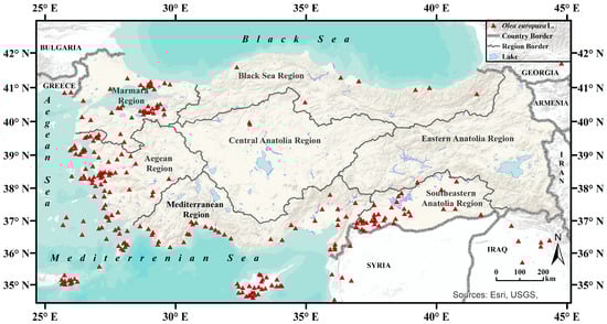Occurrence data for olive trees were compiled from the GBIF (Global Biodiversity Information Facility) database [57] and GPS coordinates collected during field observations conducted at various times and locations. Each GBIF record [57] was individually verified using Google Earth Pro to assess spatial accuracy, and records with questionable or incorrect locations were removed from the dataset. To prevent overfitting, a 5 km spatial filtering was applied to the occurrence records using the ‘Spatially Rarefy Occurrence Data’ tool in ArcMap (version 10.8.1) SDM Toolbox v2.5 [58,59]. After filtering, 256 records were retained for analysis (Figure 2). Absence data, representing areas unsuitable for olive cultivation, were randomly generated in the R environment. To reduce spatial autocorrelation, a 10,000 km2 spatial filtering was also applied to these absence records in R.