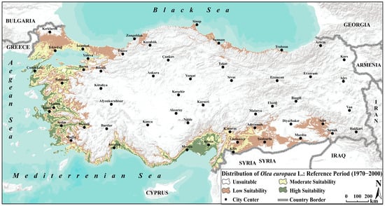 - Özdel, M.M.; Ustaoğlu, B.; Cürebal, İ. Modeling of the potential distribution areas suitable for olive (Olea europaea L.) in Türkiye from a climate change perspective. Agriculture 2024, 14, 1629. [Google Scholar] [CrossRef]