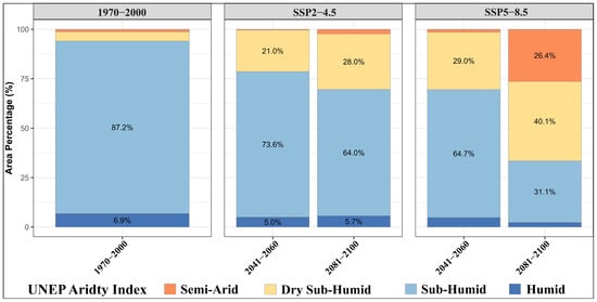 Under the SSP2–4.5 scenario, the proportion of suitable olive habitats in the sub-humid class declines to 73.6%, while dry sub-humid areas increase to 21% during the 2041–2060 reference period. By the end of the century, this trend becomes more pronounced, with sub-humid areas decreasing to 64% and dry sub-humid areas rising to 28%. This indicates that suitable habitats for olive trees are gradually shifting toward drier climatic conditions, and redistributing under increasing water stress. The high-emissions SSP5–8.5 scenario shows an even more dramatic transformation. In the near future, 64.7% of suitable areas fall within the sub-humid class, while 29% are classified as semi-arid. By 2081–2100, 40.1% of suitable areas are projected to be in the semi-arid class and 31.1% in the sub-humid class. Notably, 26.4% of suitable habitats will experience semi-arid conditions during the same period (Figure 8). This finding suggests that by the end of the century, more than two-thirds of olive-suitable areas will be exposed to significant aridity pressure.