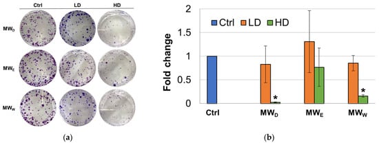 (a) Representative images of clonogenic assay of F. standishii MW fractions against HeLa cells. (b) Normalized average number of colonies after exposure for 7 days to MW fractions at two doses (low dose, LD; high dose, HD). MWD (dichloromethane fraction) = 3 and 8.5 µg/mL; MWE (ethyl acetate fraction) = 8 and 25 µg/mL; MWW (water fraction) = 14 and 43 µg/mL. Error bars: SD after 3–4 replicates. * p < 0.05. Ctrl: untreated cells.
