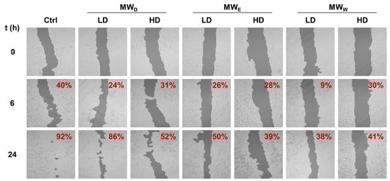 Representative images of wound closure assay of F. standishii MW fractions against A549 cells. Images were taken after 6 and 24 h of exposure to MW fractions at two doses (low dose, LD; high dose, HD). MWD (dichloromethane fraction) = 5 and 14 µg/mL; MWE (ethyl acetate fraction) = 17 and 50 µg/mL; MWW (water fraction) = 49 and 146 µg/mL. Wound closure percentage with respect to time = 0 is given on the right top corner of each image. Ctrl: untreated cells.