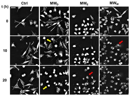 Representative snapshots of HeLa cells exposed for 20 h to MW fractions. MWD (dichloromethane fraction) = 0.043 µg/mL; MWE (ethyl acetate fraction) = 0.125 µg/mL; MWW (water fraction) = 0.215 µg/mL. Yellow arrows indicate the presence of apoptotic cells. Red arrows indicate the presence of necrotic cells. Scale bar = 40 µM. Ctrl: untreated cells.