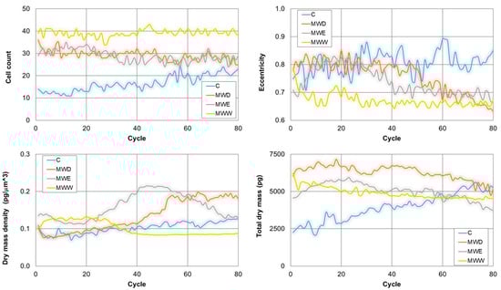 Kinetics of representative phenotypic parameter for untreated HeLa cells, and cells exposed to fractions for 20 h. MWD (dichloromethane fraction) = 0.043 µg/mL; MWE (ethyl acetate fraction) = 0.125 µg/mL; MWW (water fraction) = 0.215 µg/mL. C: untreated cells.
