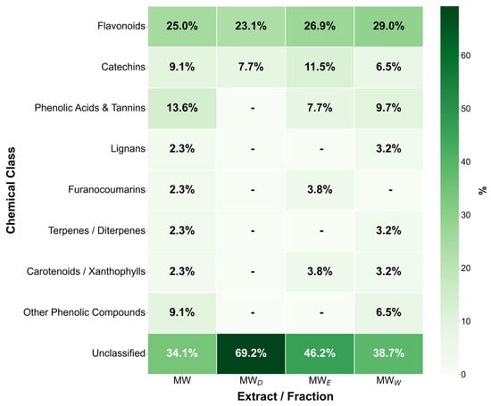 Percentages of Key compound classes derived from UHPLC-DAD-MS3 analysis of Fuchsia standishii hydroalcoholic extract and derived fractions.