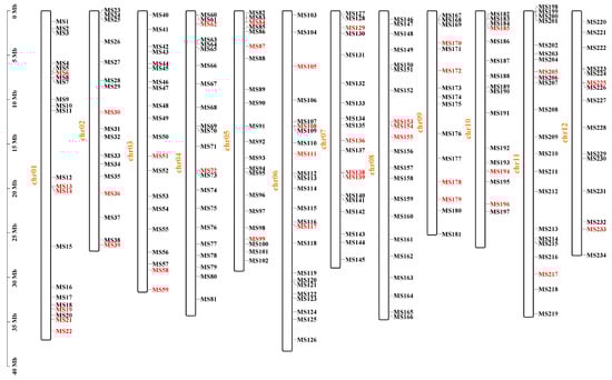 The distribution of 234 InDels on the 12 melon chromosomes. The 39 primer pairs highlighted in red represent the final set of polymorphic markers selected for genetic analysis.