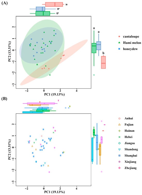 The principal analysis (PCA) score plot depicting the distribution of 40 melon varieties. Individuals are color-coded with melon types (A) and geographical origin (B). Significant differences (p < 0.05) are indicated by different letters.