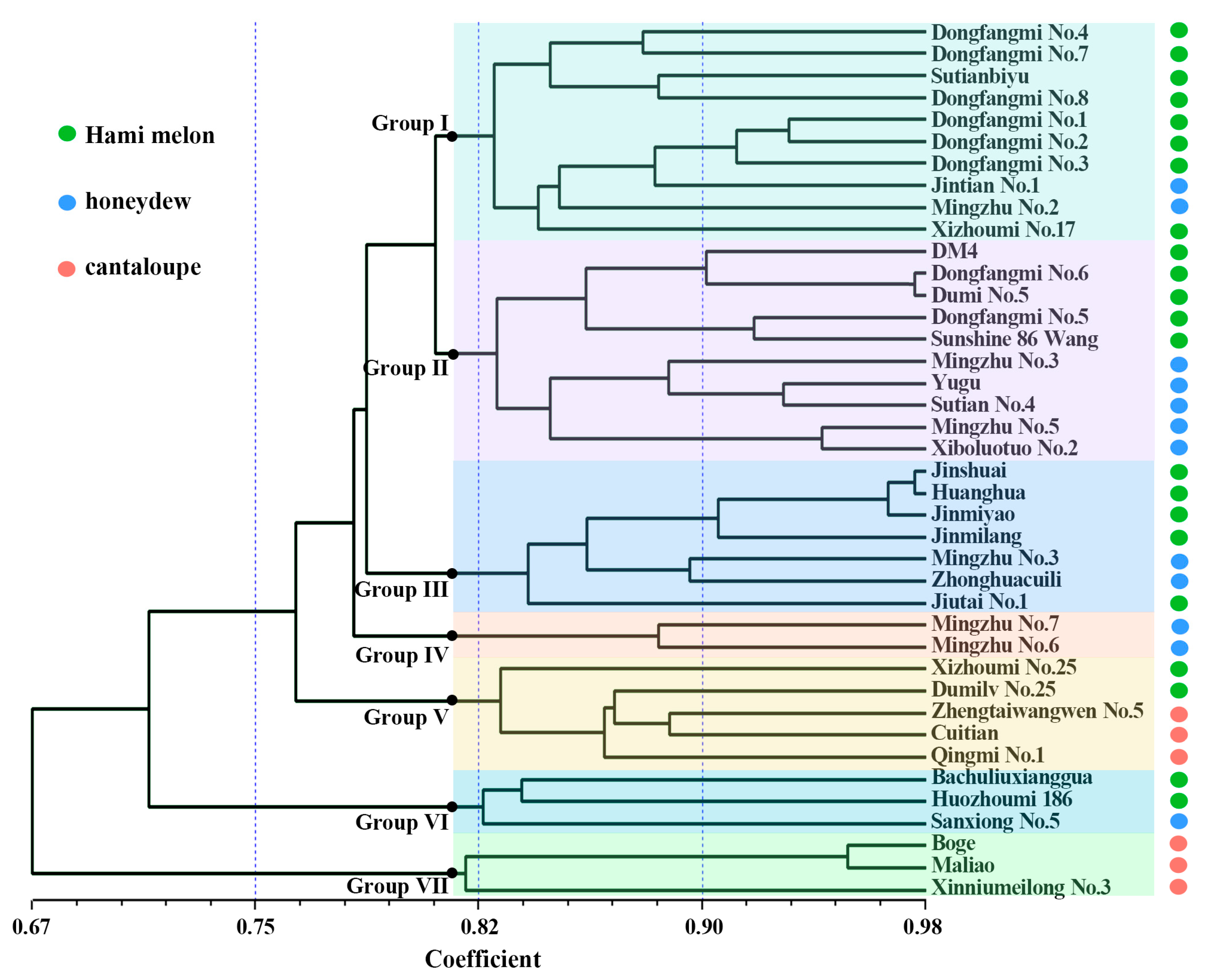 - Zhang, J.; Yang, J.; Lv, Y.; Zhang, X.; Xia, C.; Zhao, H.; Wen, C. Genetic diversity analysis and variety identification using SSR and SNP markers in melon. BMC Plant Biol. 2023, 23, 39. [Google Scholar] [CrossRef]
