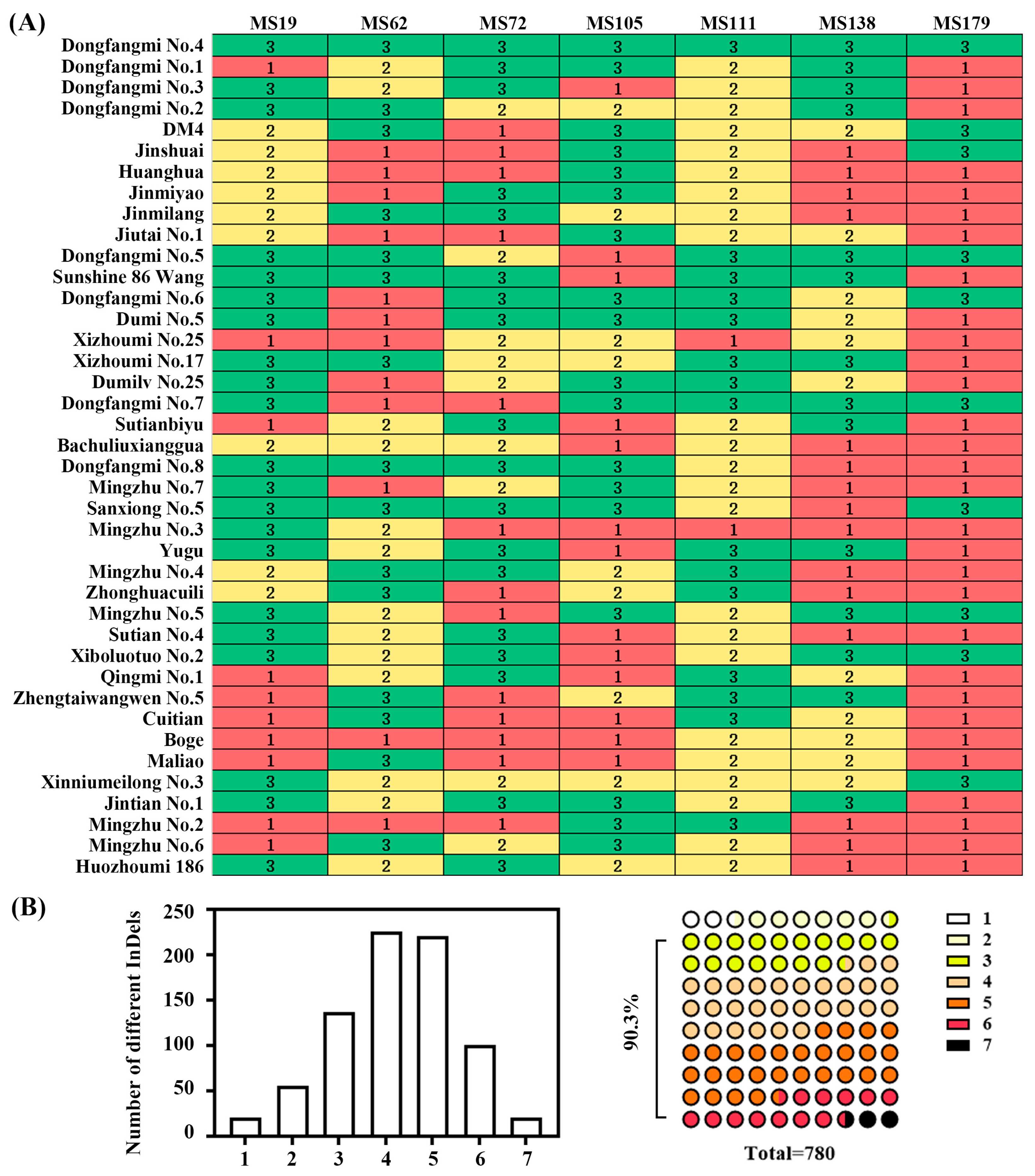 3.1. Distribution Characteristics of InDels and Their Value in Marker Development