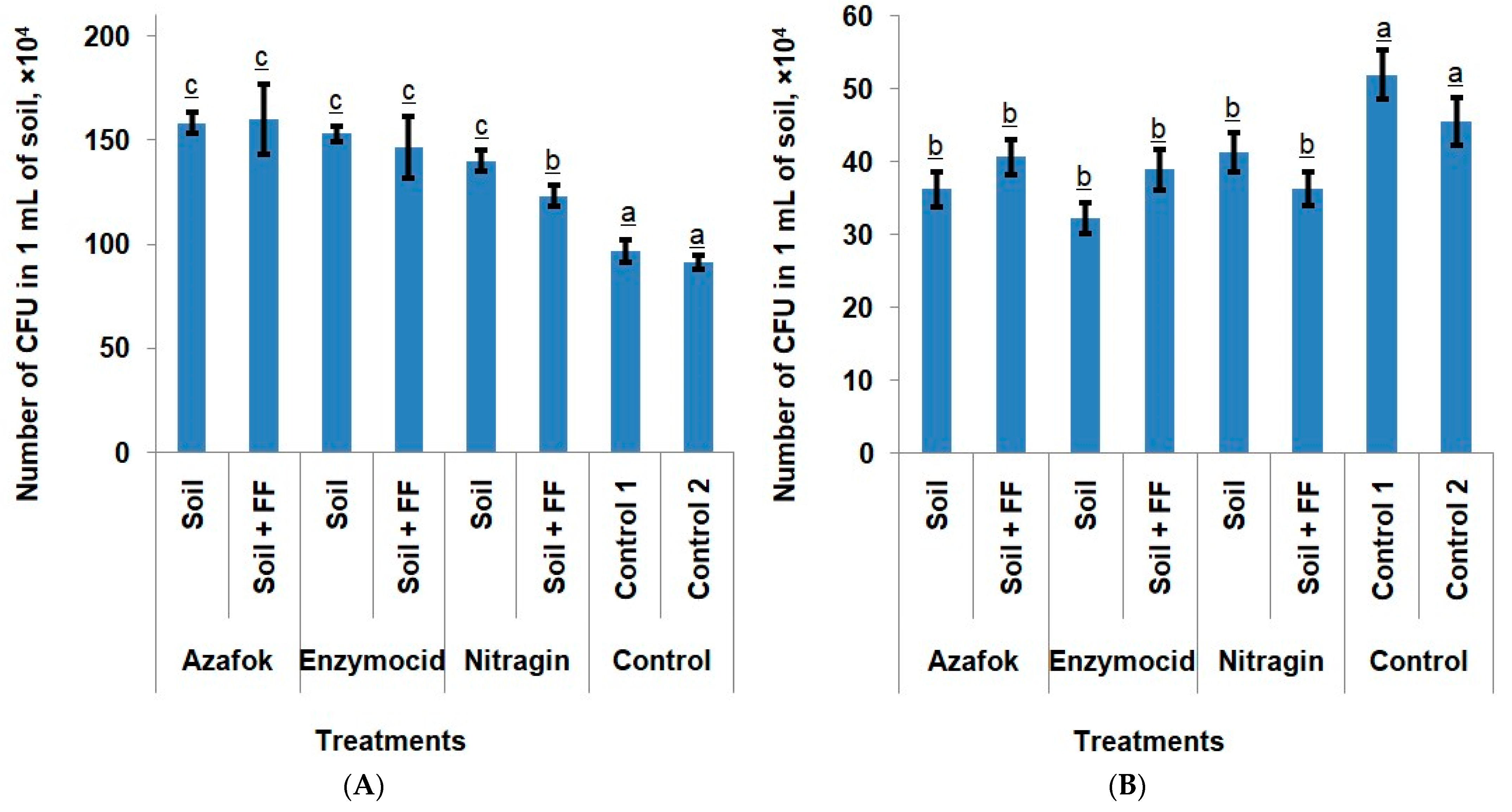 We did not observe significant differences in the bacterial colonization of soil samples depending on which MFs was applied. In the treatments where only soil fertilizers were used, Enzymocid more actively reduced the number of conditionally pathogenic and pathogenic fungi than Azafok and Nitragin. The application of these preparations suppressed the growth of fungal pathogens by 37.83%, 30.25%, and 20.51%, respectively, compared to the control. No consistent patterns regarding the influence of foliar nutrition on the soil microbiota were identified (