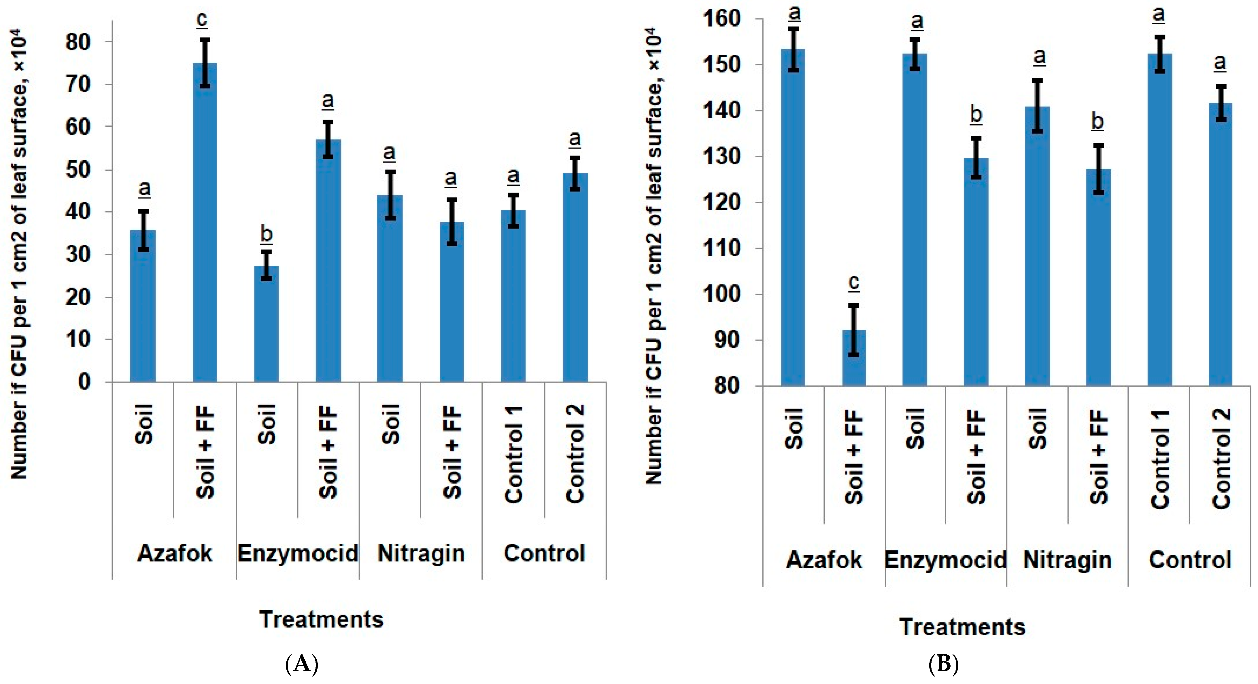 Nitragin, while maintaining the bacterial population at the controls level, contributed to a 7.4% reduction in the fungal CFU on the leaf surface. The control 2 treatment with foliar fertilization (without MFs) and Nitragin + FF did not differ significantly from the untreated control 1 in terms of bacterial activity, but a reduction in fungal colonization by 7.00% and 16.41%, respectively, was noted. This fact may indicate that the FF, although it did not cause an active increase in the number of bacteria, promoted the activation of their functional activity and, as a result, enhanced the anti-fungal effect. Another reason for the reduction in the number of micromycetes could be the indirect influence of minerals on the phylloplane microbiota through the host plant tissues. The foliar fertilizer application improved plant nutrition and, consequently, its functional state, and thus its ability to combat pathogens (