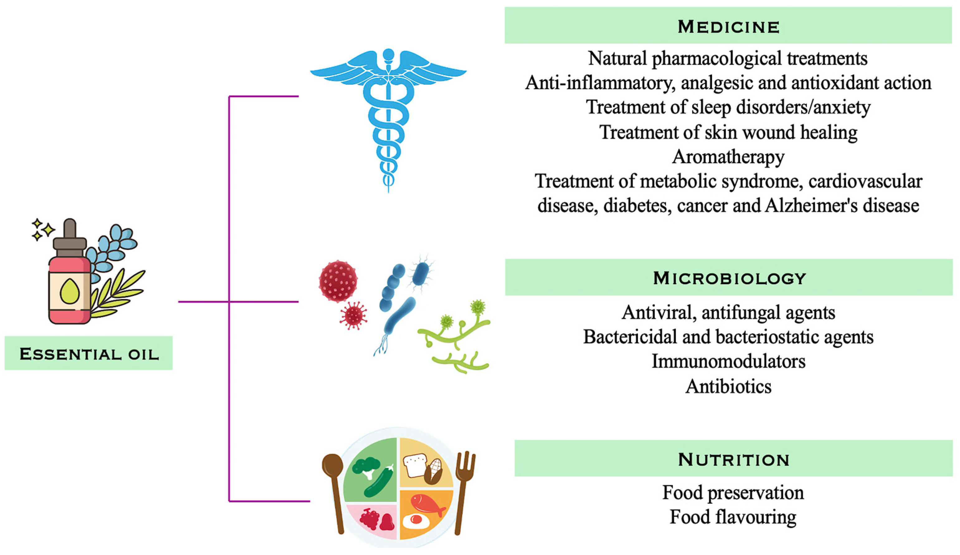 - Jugreet, B.S.; Suroowan, S.; Rengasamy, R.R.K.; Mahomoodally, M.F. Chemistry, bioactivities, mode of action and industrial applications of essential oils. Trends Food Sci. Technol. 2020, 101, 89–105. [Google Scholar] [CrossRef]