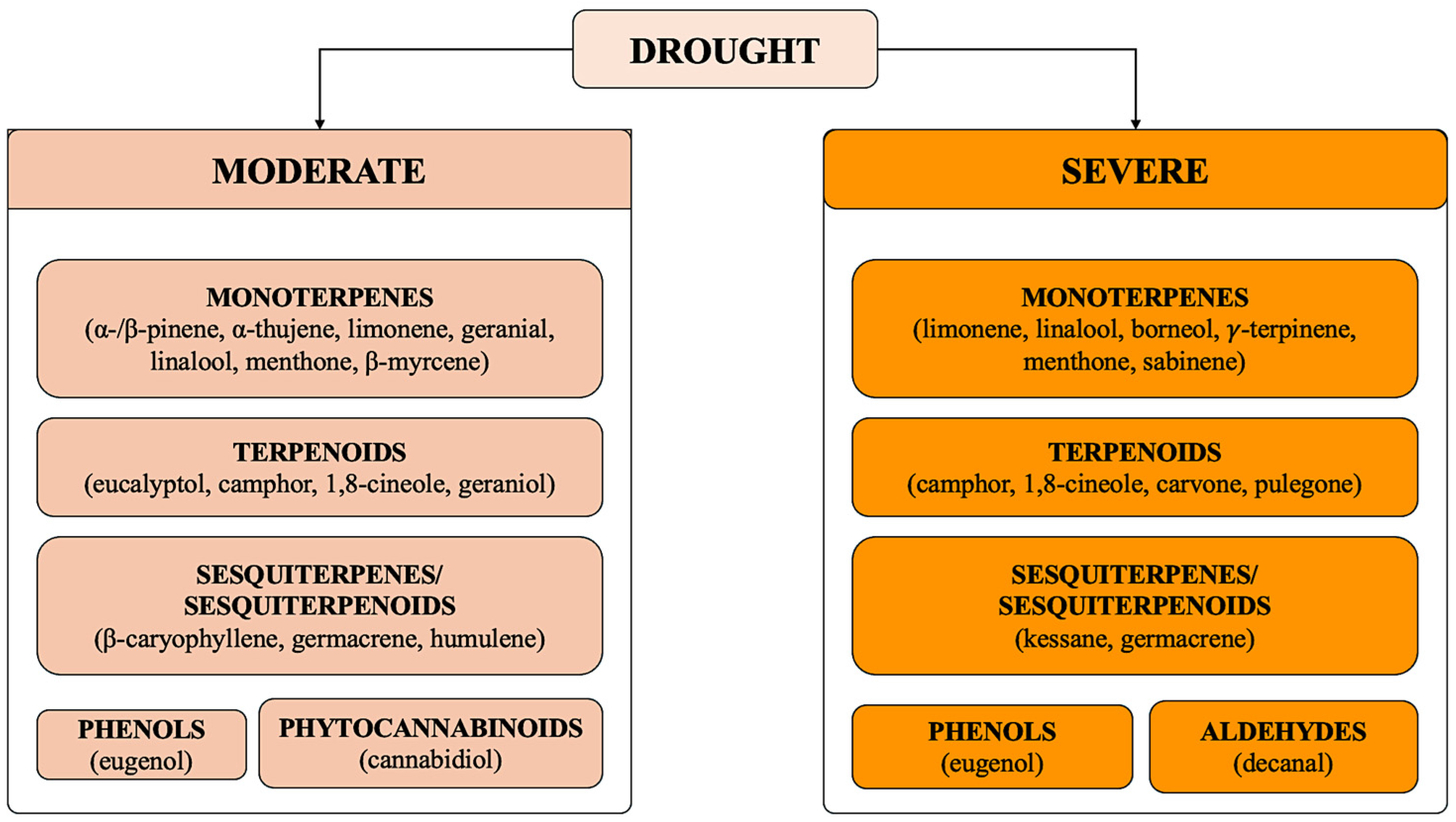 | Mentha longifolia (L.) Huds. | Greenhouse | Plant shoots | Decrease synthesis under moderate and severe stress. Change in chemical composition concerning limonene and carvone. | [60] |