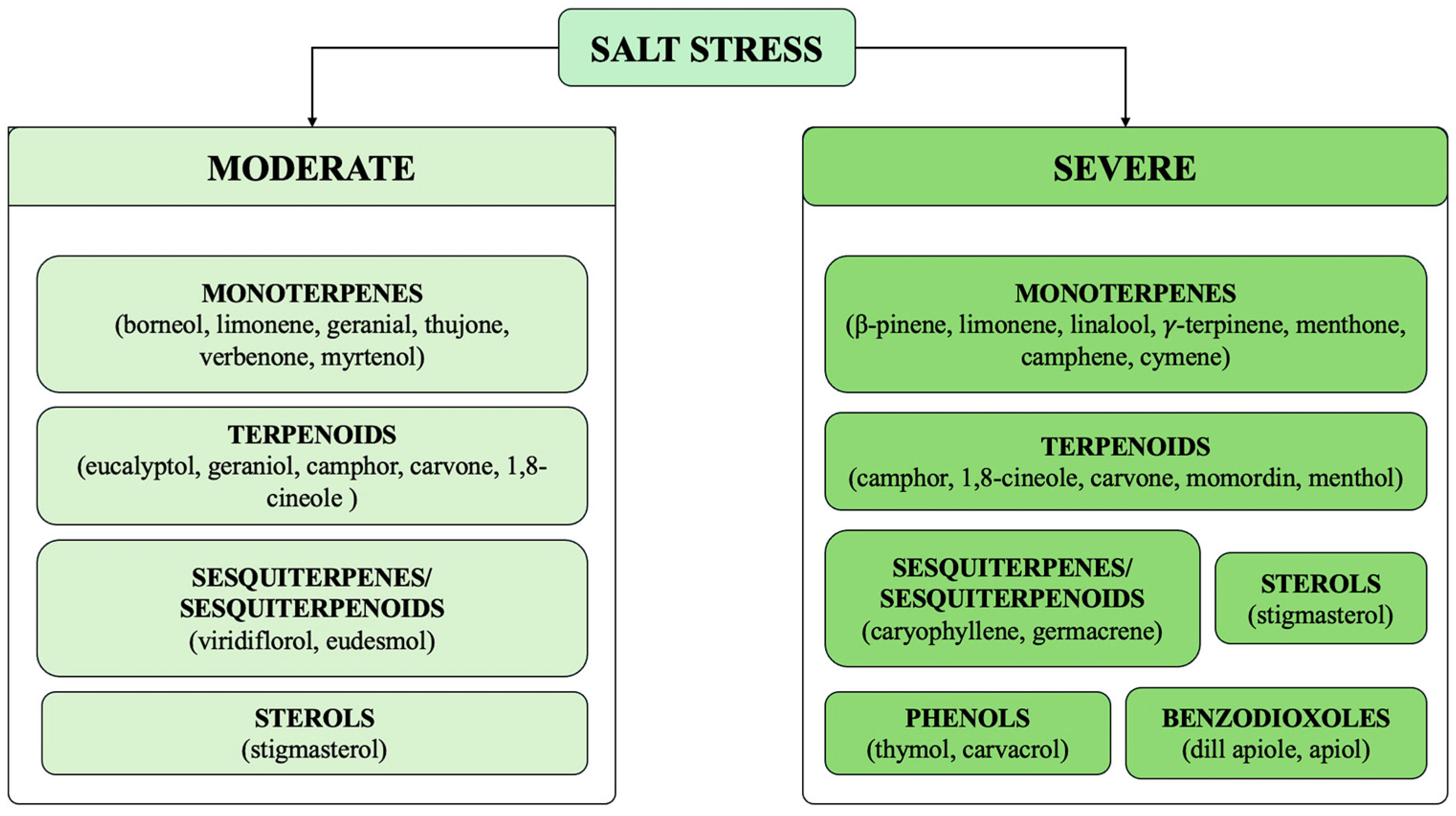 | Cuminum cyminum L. | Hydroponically cultivated in a saline solution | Seeds | Decrease under severe stress. Change in chemical composition concerning β-pinene, 1-phenyl-1,2 ethanediol, and camphor. | [70] |