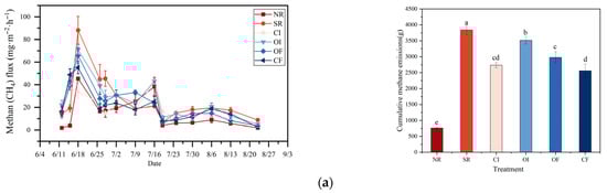 The cumulative CH4 emissions, ranked from highest to lowest, are as follows: SR >OI > CI > OF > CF > NR (Figure 3). Among these, SR exhibits significantly higher CH4 emissions compared to all other treatment groups, being approximately 400% greater than NR (Table S2). In contrast, NR shows the lowest CH4 emissions, which are significantly lower than those of all other treatments. OI produces CH4 emissions that are significantly higher than those observed under CI, OF, and CF, although they remain 29% lower than those under SR. OF results in higher CH4 emissions than CF, whereas no significant differences are found between CI and either OF or CF. Among all oxygenation-related treatments, CF demonstrates the lowest CH4 emissions, which are 33% lower than those from SR. However, an unusually sharp and pronounced CH4 flux peak occurred around June 18, during which the flux rose dramatically (Table S3). This spike is attributed to the temporary presence of methanogenic substrates, likely from residual organic matter. Since no additional exogenous carbon (such as straw) was supplied, the availability of methanogenic substrates quickly became limited, causing the CH4 flux peak to subside shortly thereafter. In contrast, the straw incorporation treatment maintained consistently high CH4 flux levels throughout the entire monitoring period, significantly and steadily exceeding the flux levels observed in all other treatments. This result confirms that under conventional flooded and incorporated management practices, the decomposition of straw leads to continuous and intense CH4 emissions.