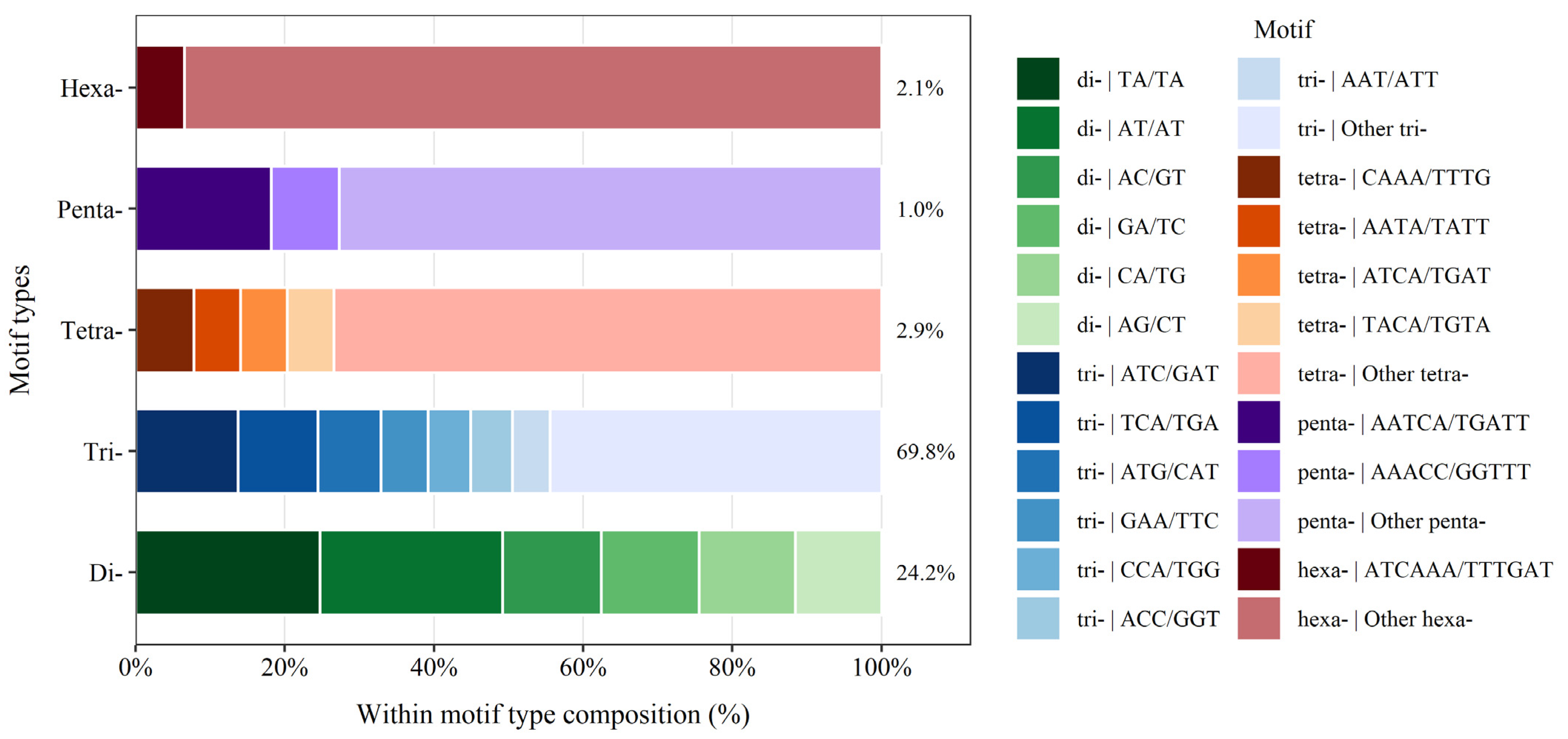 2.3. Frequency, Characterization, and Distribution of Microsatellite Repeats in H. italicum Transcriptome