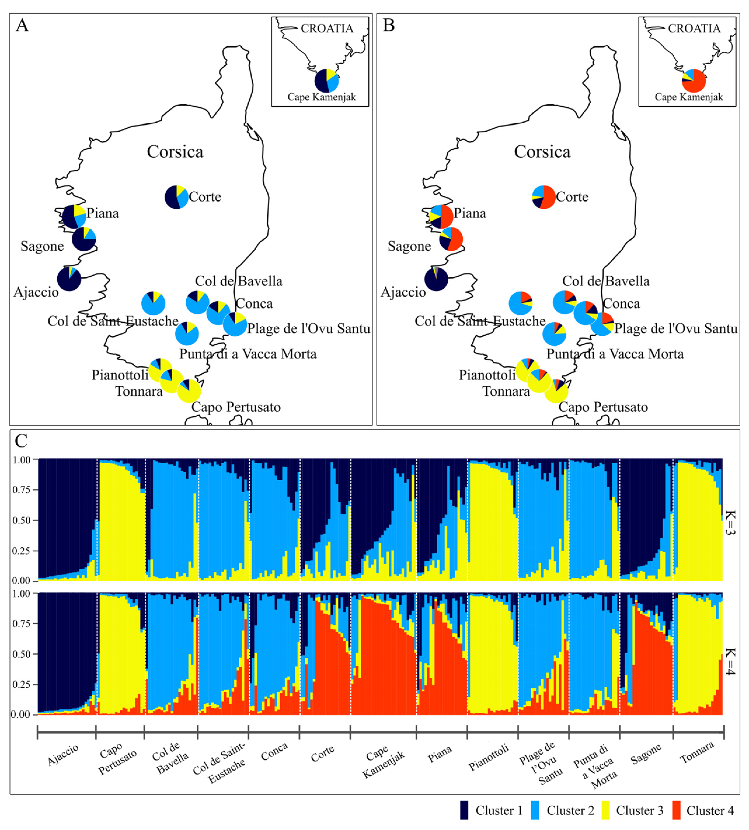 - Hladnik, M.; Baruca-Arbeiter, A.; Gabrovšek, P.; Tomi, F.; Gibernau, M.; Brana, S.; Bandelj, D. New chloroplast microsatellites in Helichrysum italicum (Roth) G. Don: Their characterization and application for the evaluation of genetic resources. Plants 2024, 13, 2740. [Google Scholar] [CrossRef]