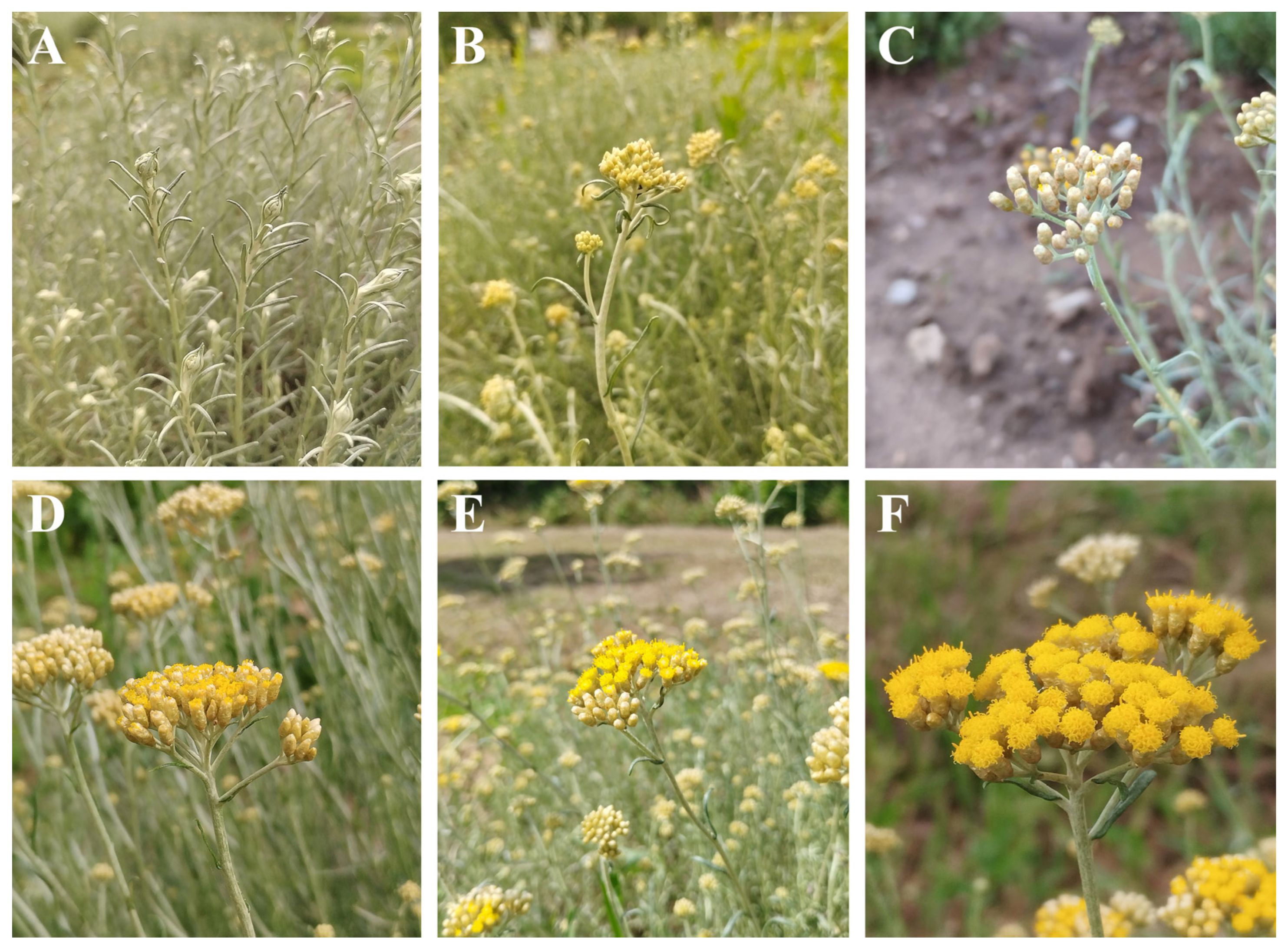 - Herrando-Moraira, S.; Blanco-Moreno, J.M.; Galbany-Casals, M. Re-evaluation of the Helichrysum italicum complex (Compositae: Gnaphalieae): A new species from Majorca (Balearic Islands). Collect. Bot. 2016, 35, e009. [Google Scholar] [CrossRef]